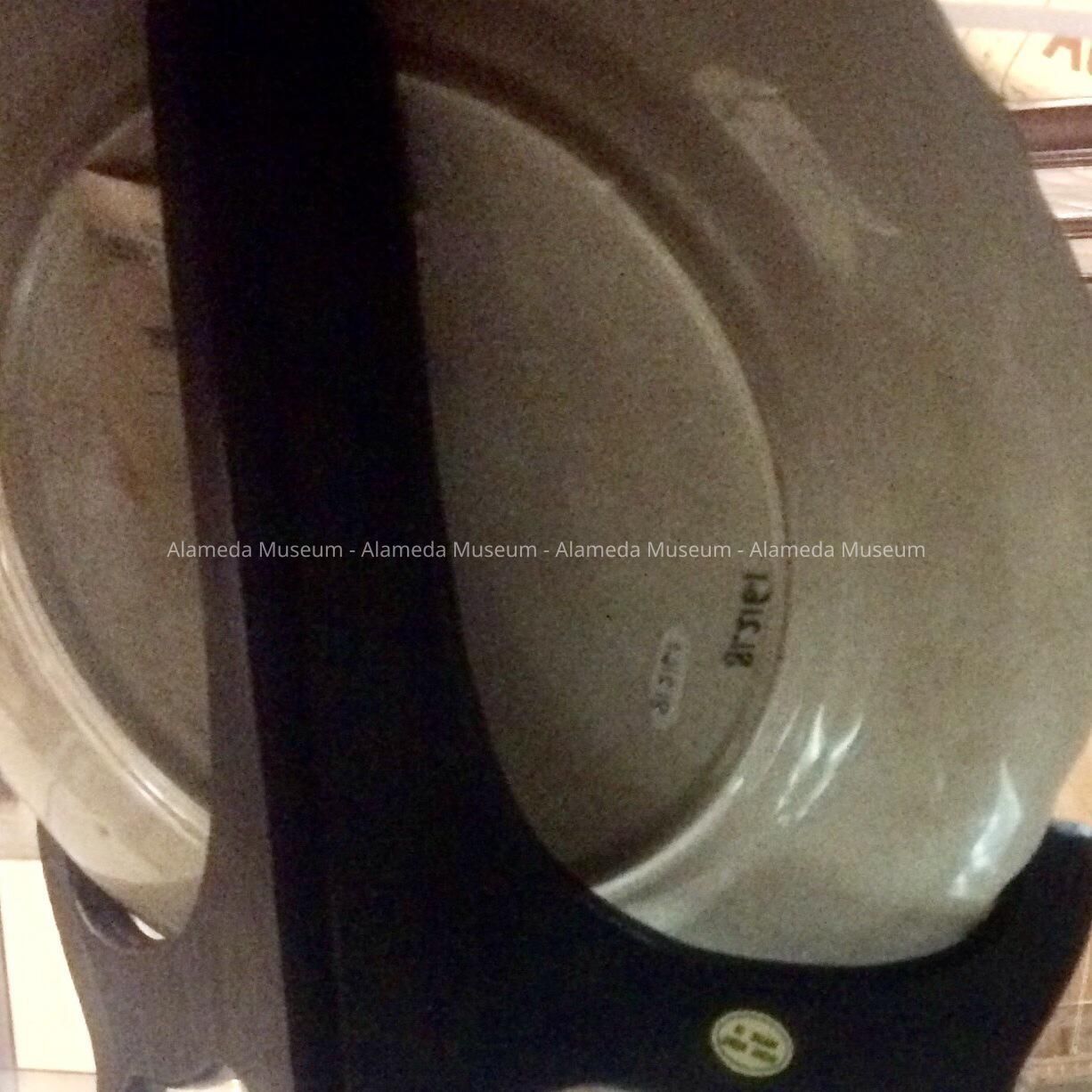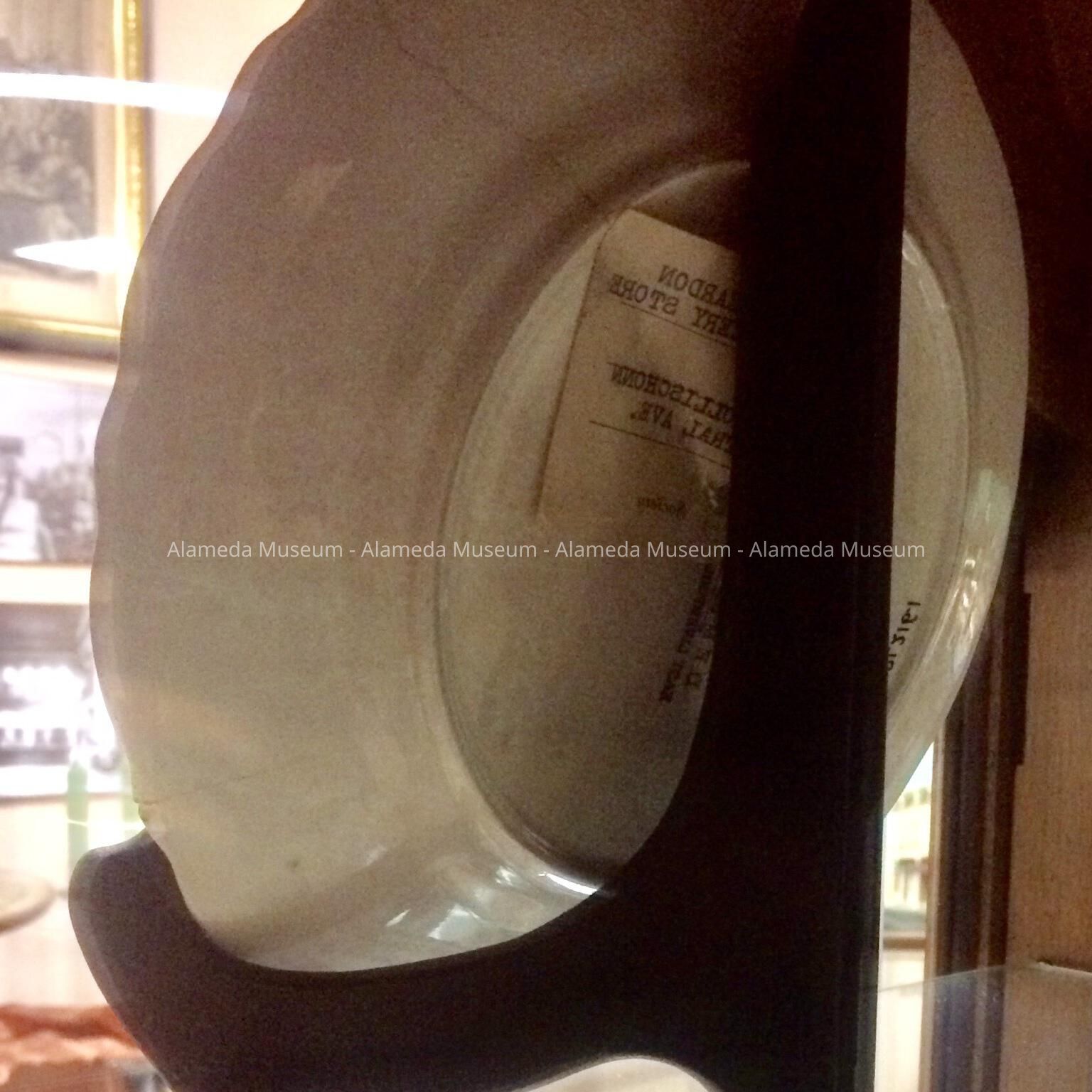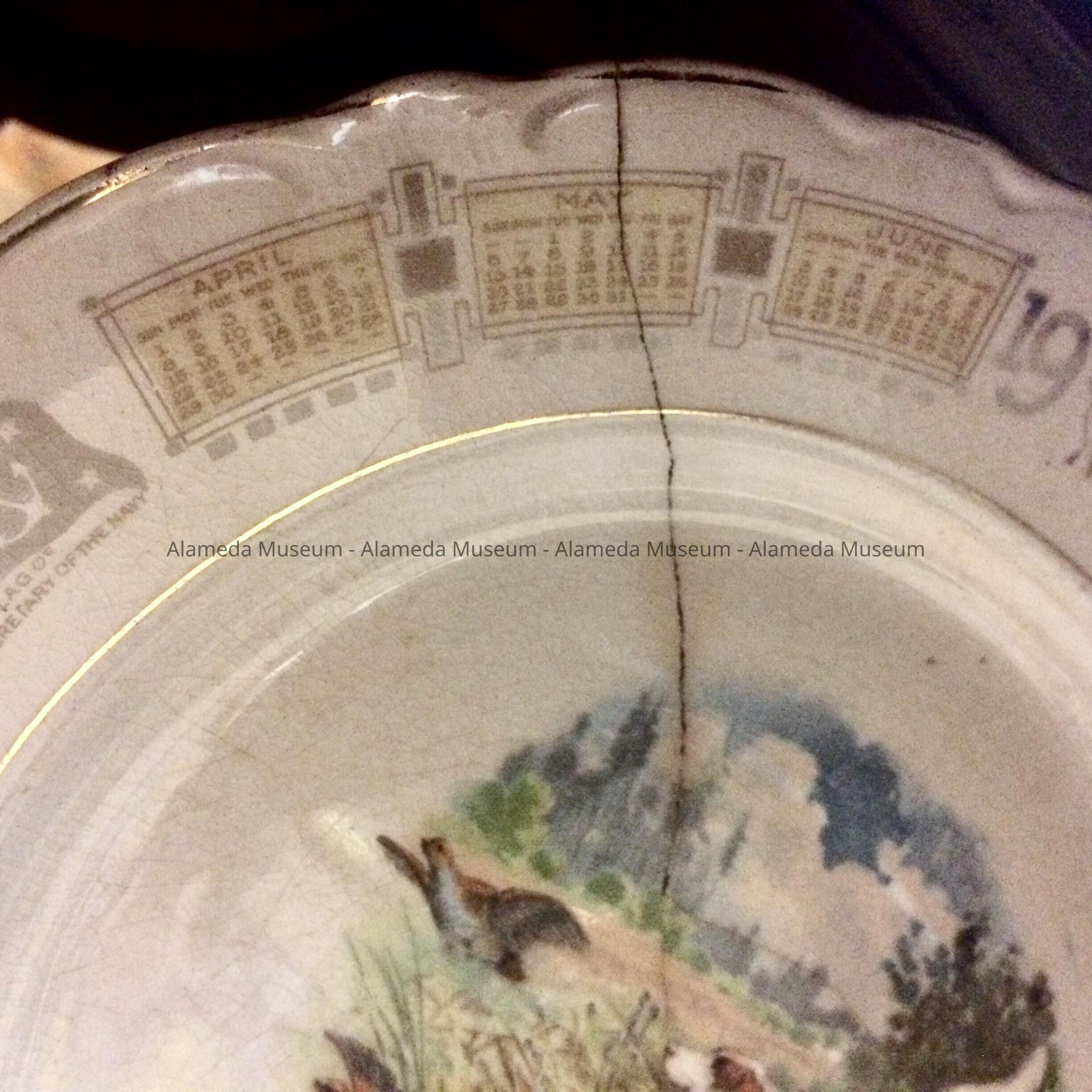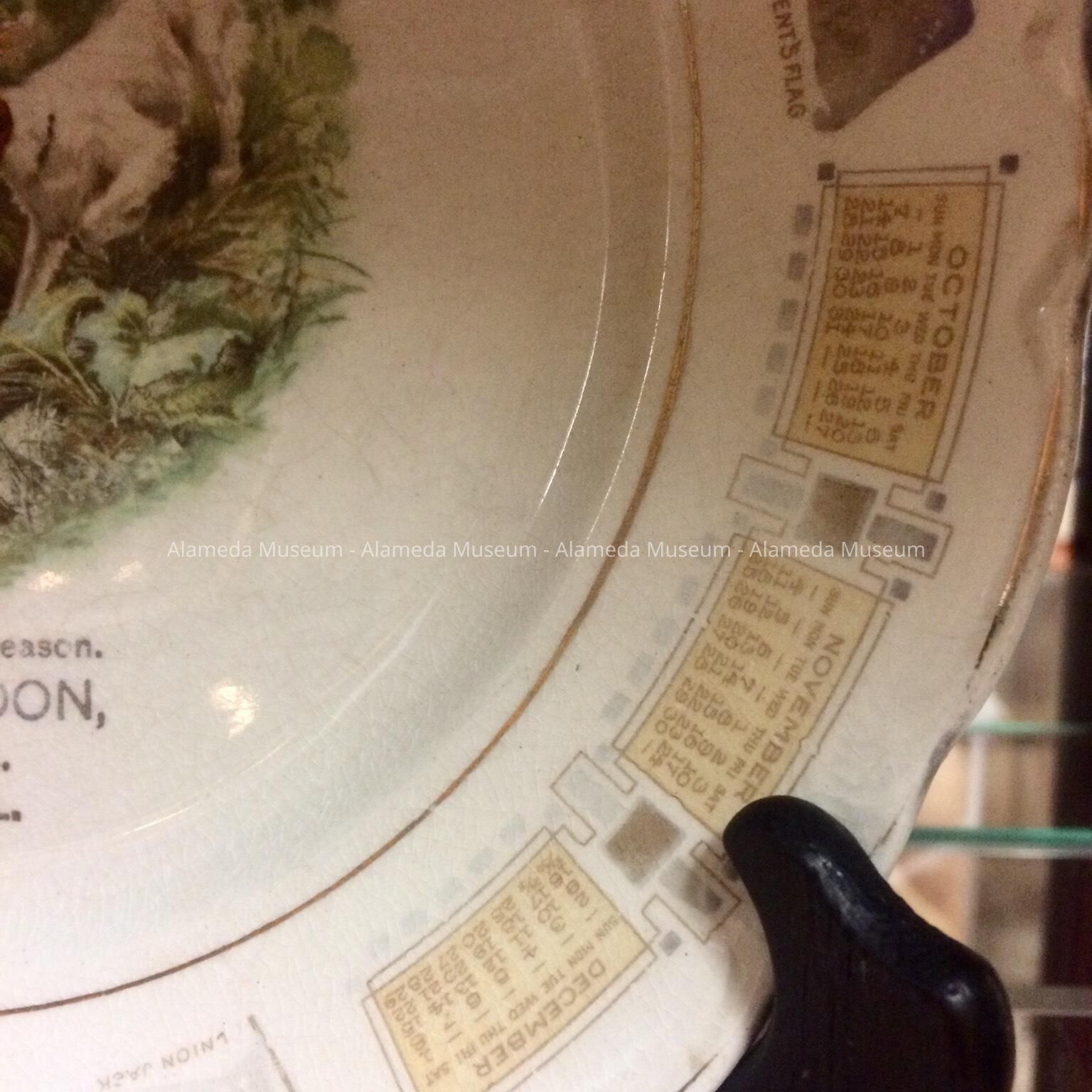 Description: Semi porcelain plate, manufactured by D, E. McNicol, East Liverpool, Ohio. The face of the plate has a transferred scene of hunting dogs and fowl. Below this scene it says, "Compliments of the Season, John Reardon, 1539 Lincoln Ave., Alameda, Cal.” Around the border of the plate are the twelve months of the year 1917 flanking the American flag. Size is 8½" in diameter.
