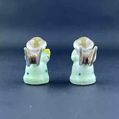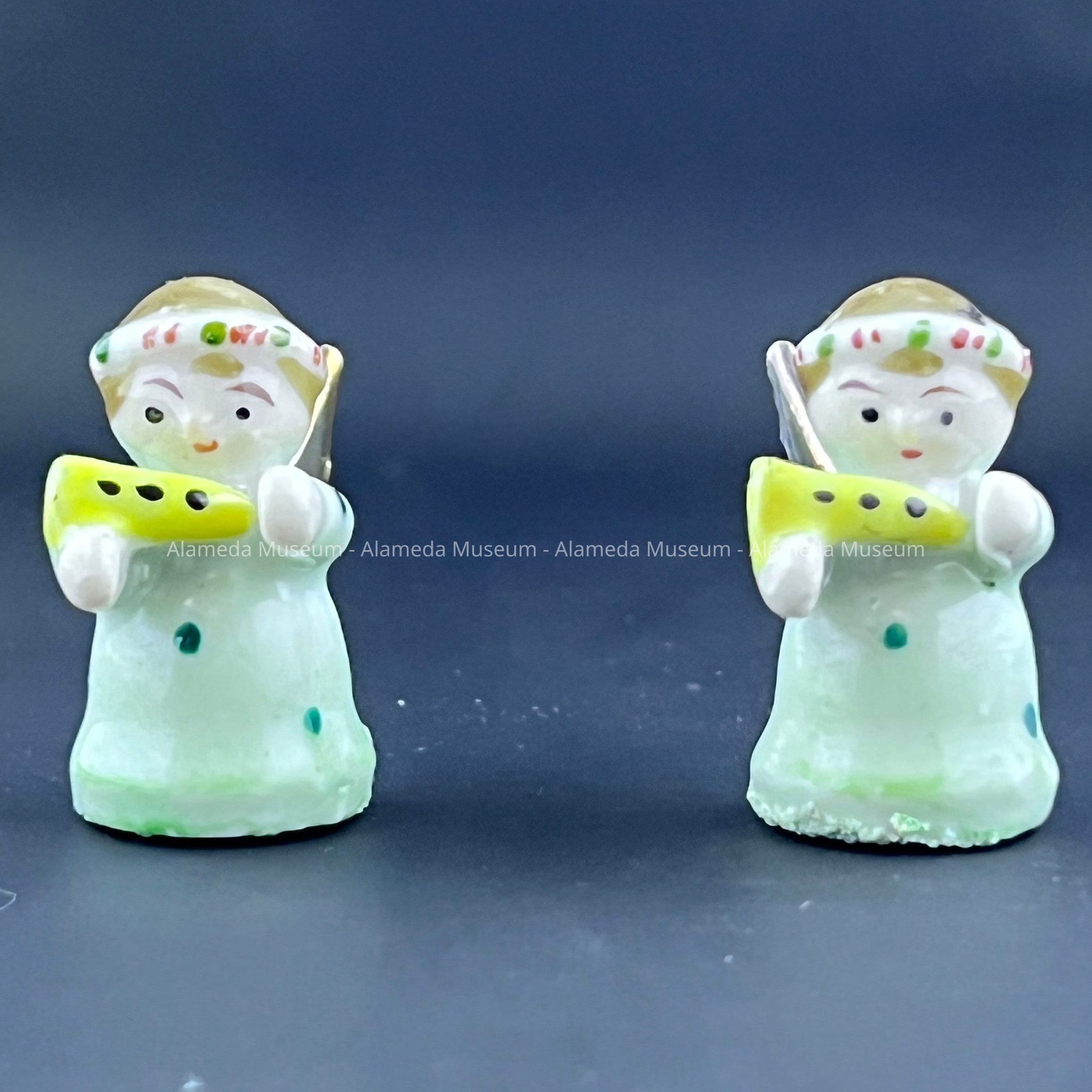 Description: Two brown haired angels with a Christmas headbands holding yellow flutes. There is gold paint on the wings on their backs and they are wearing blue robes with dots on it. Marked on the base 'JAPAN'.