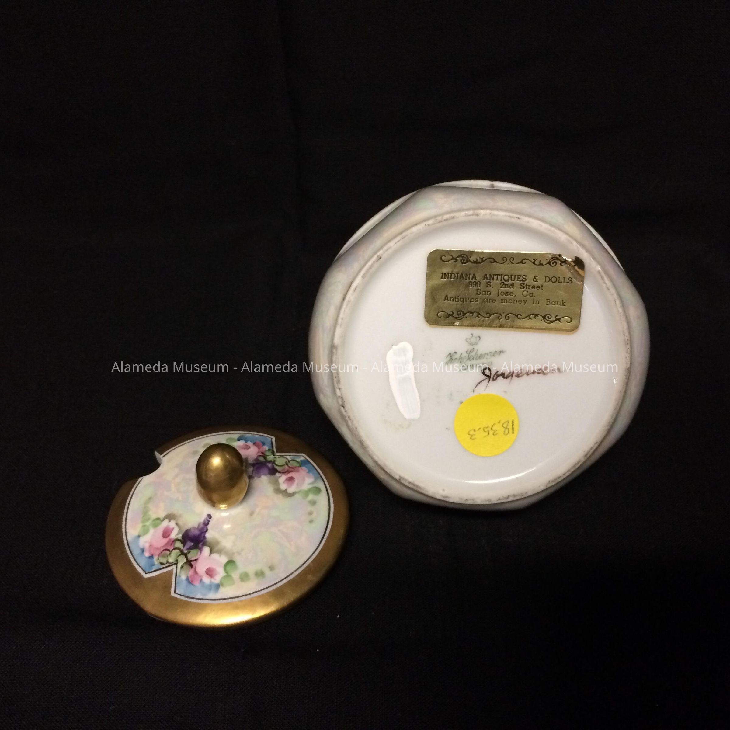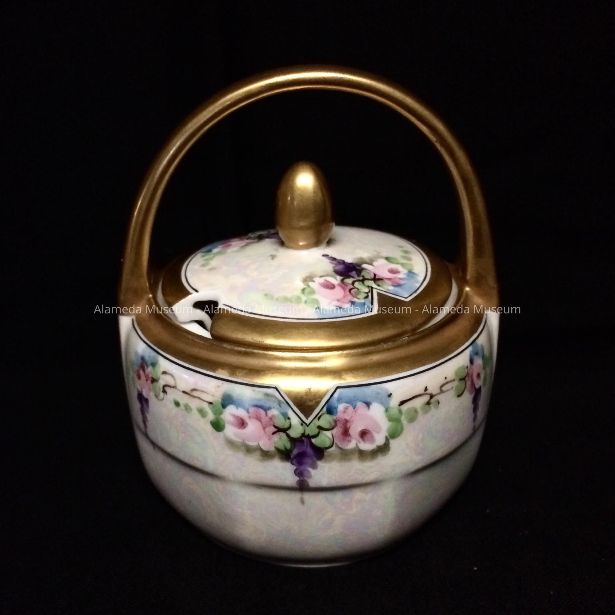 History of Object: A jam pot hand painted by Thomas Jorgensen (1878-1948) an Alameda artist and resident.