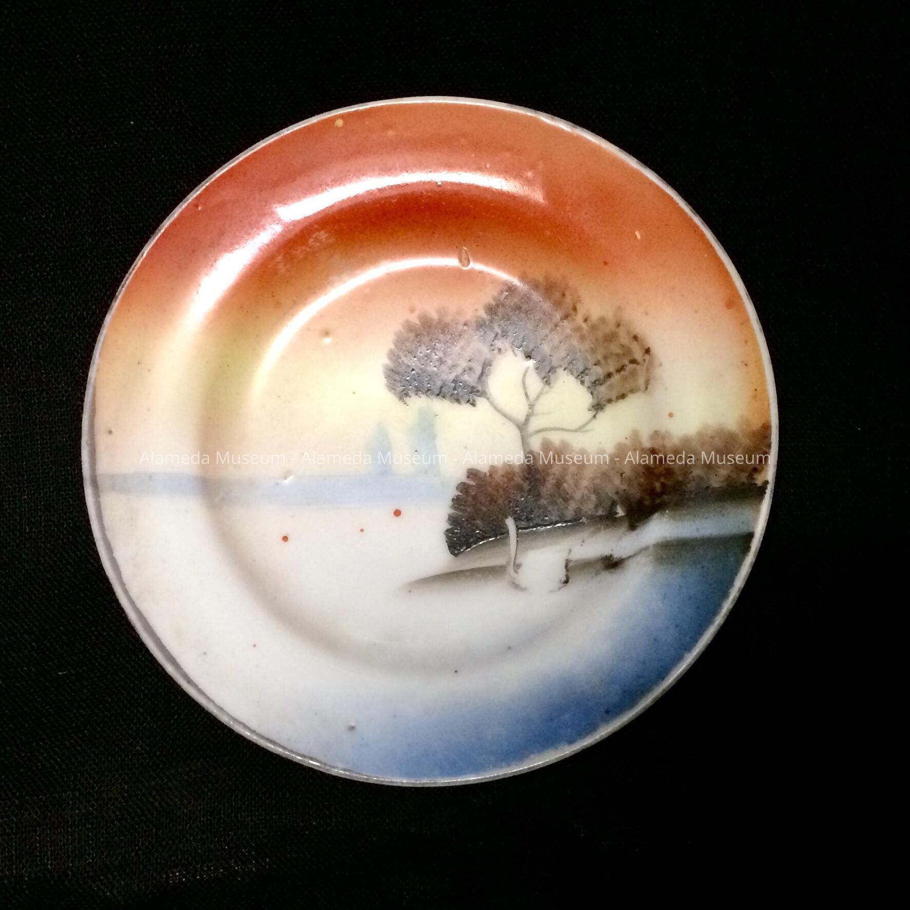 Description: A small porcelain dish with a hand painted scene of trees and water. It is unsigned, but it appears to be of Japanese manufacture.