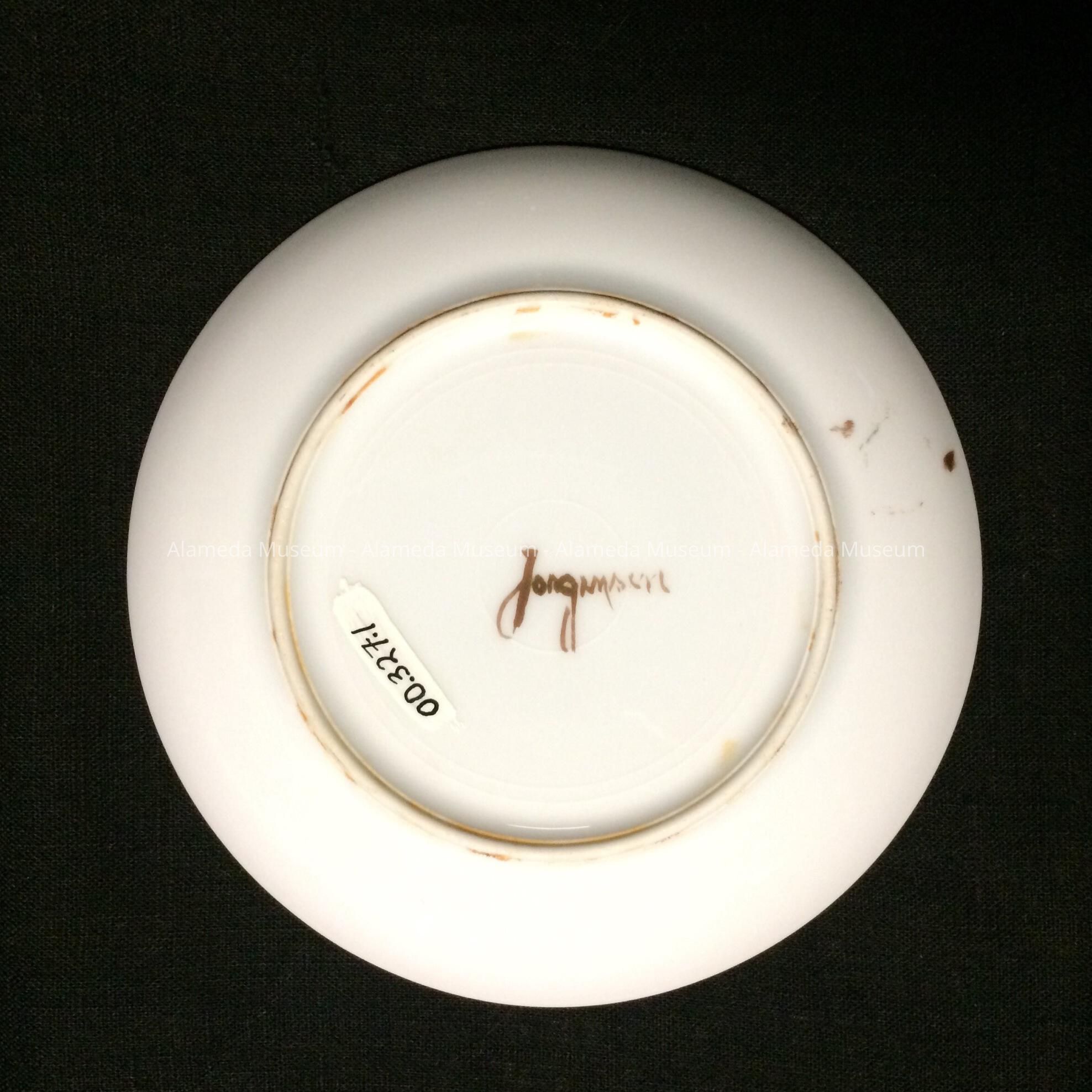 HISTORY OF OBJECT: MINOR EXAMPLE OF THE WORK OF JORGENSEN, HUSBAND AND WIFE TEAM WHO PAINTED PORCELAIN AND HAD A STUDIO ON WEBSTER STREET, ALAMEDA, IN THE 1930's.