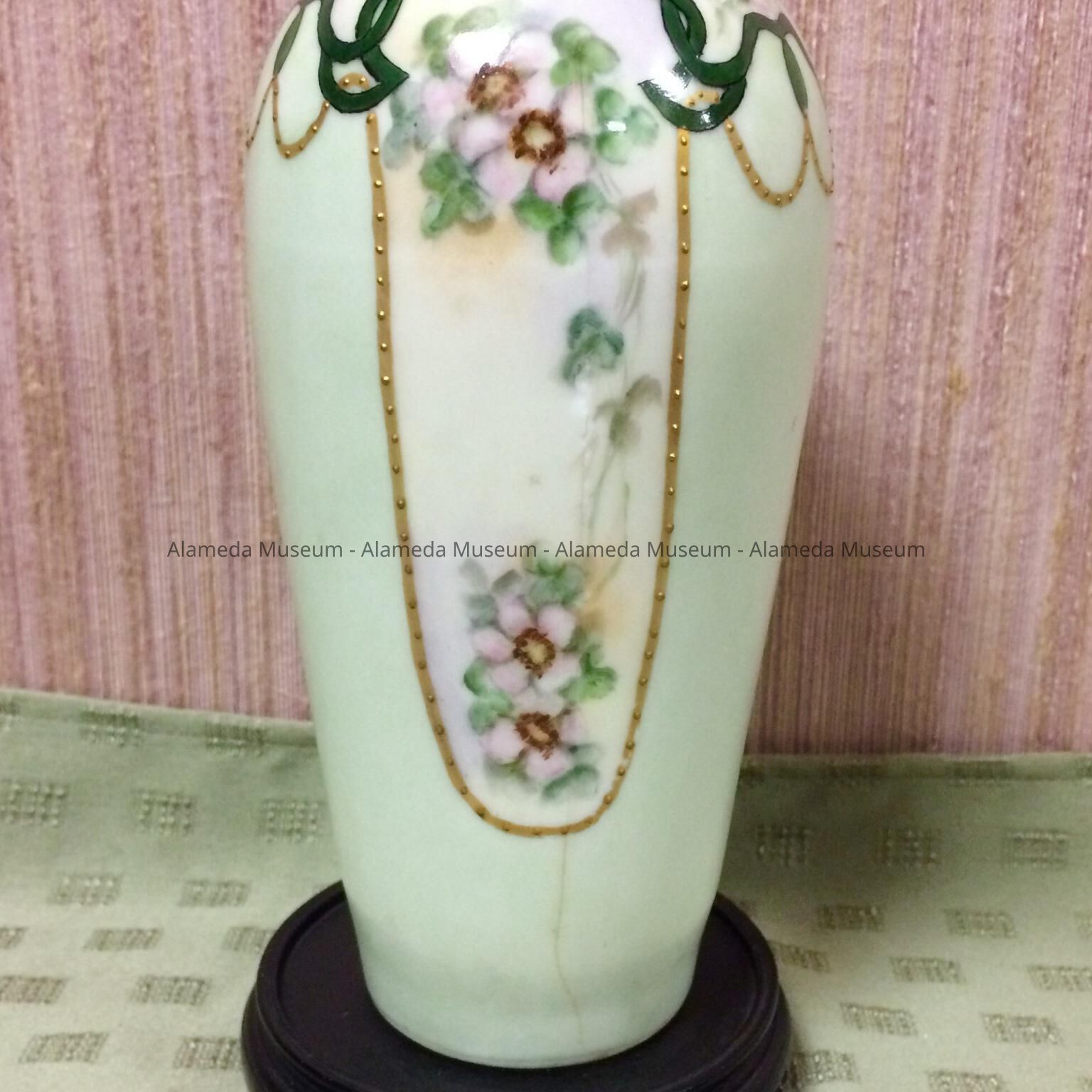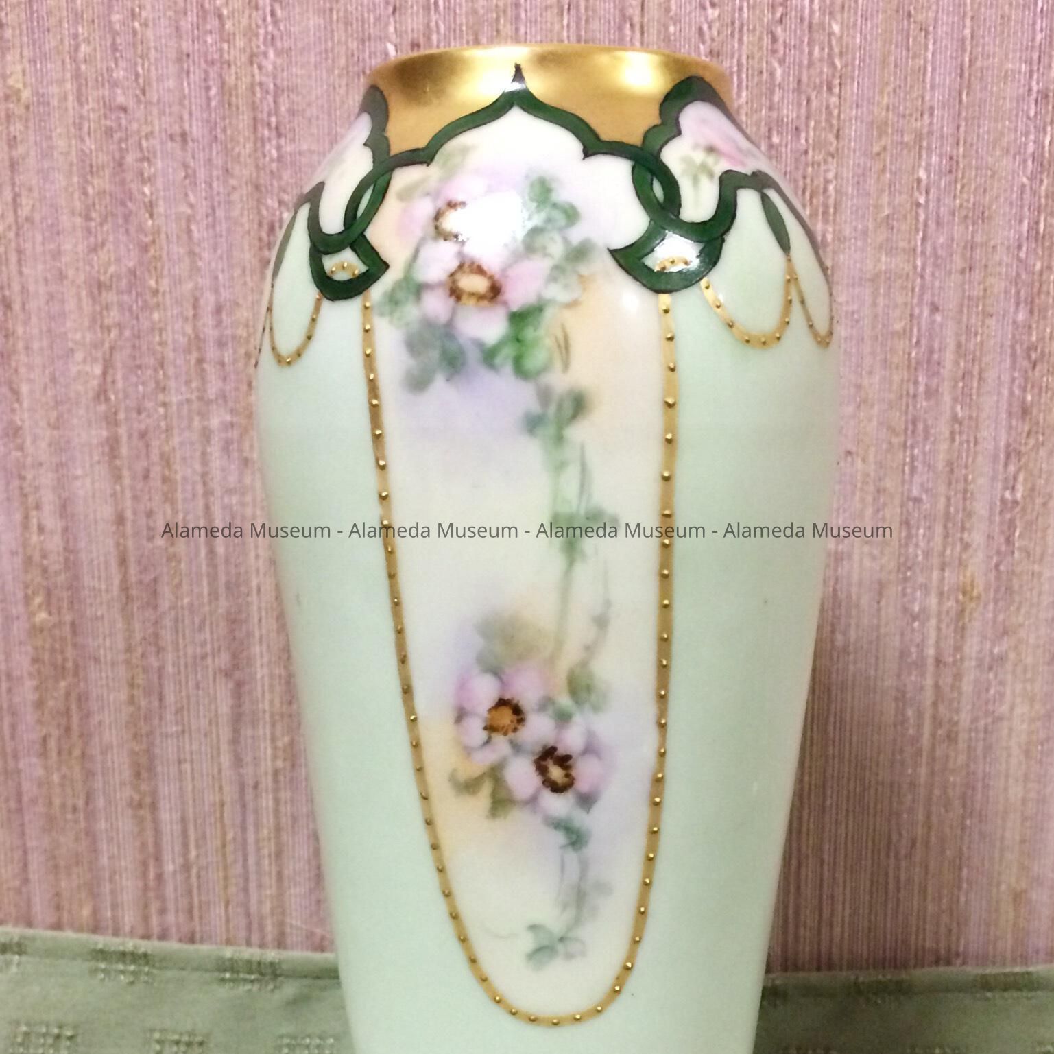History of Object: Porcelain flower vase painted by Anna J. Spreckels, professional china decorator, 1807 Lincoln Avenue, Alameda.