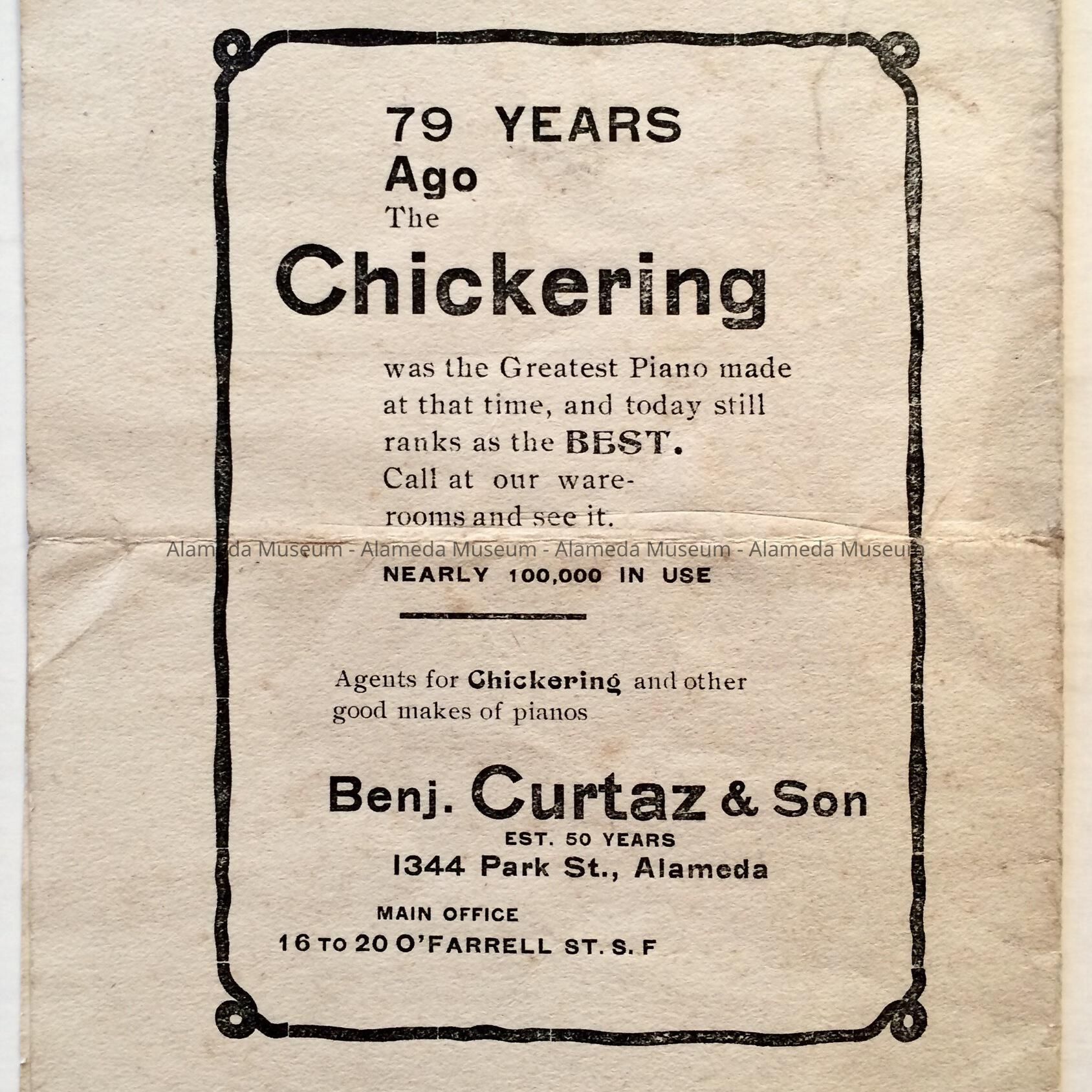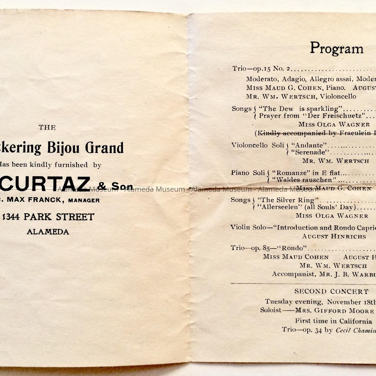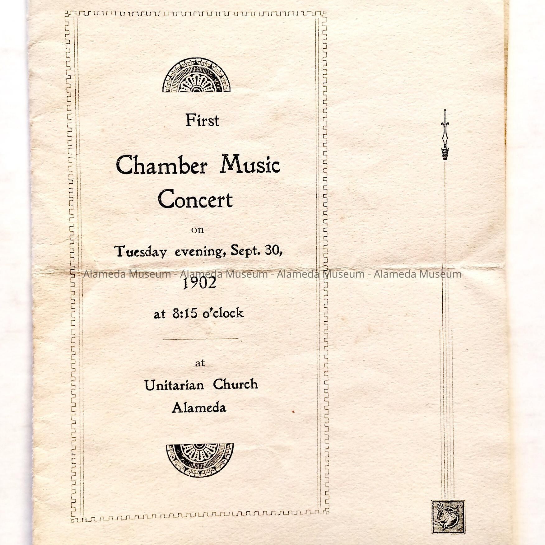 PROGRAM OF CHAMBER MUSIC CONCERT, HELD ON SEPTEMBER 30, 1902, AT THE UNITARIAN CHURCH, GRAND STREET BETWEEN SANTA CLARA AND LINCOLN AVENUES, ALAMEDA, CALIFORNIA.
