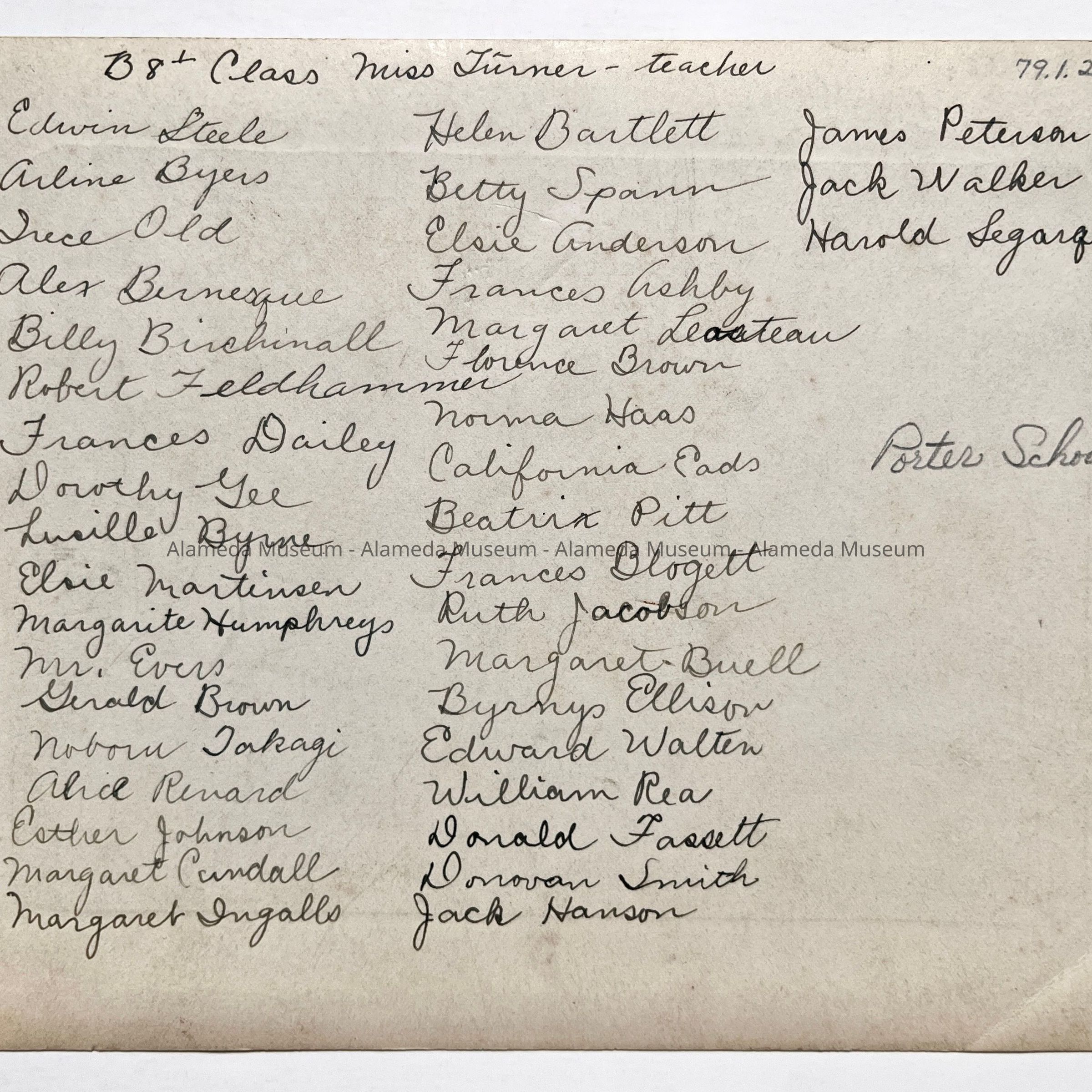 HISTORY OF OBJECT: CLASS PICTURE, PORTER SCHOOL, NOT DATED. COMPLETE LISTING OF CHILDREN'S NAMES ON REVERSE SIDE. TEACHER, MISS. TURNER.