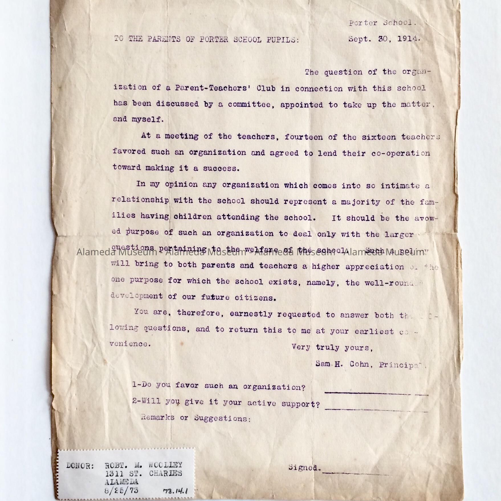 HISTORY OF OBJECT: LETTER TO PARENTS, DATED 1914, CONCERNING FORMATION OF THE PARENTS TEACHERS CLUB IN PORTER SCHOOL.