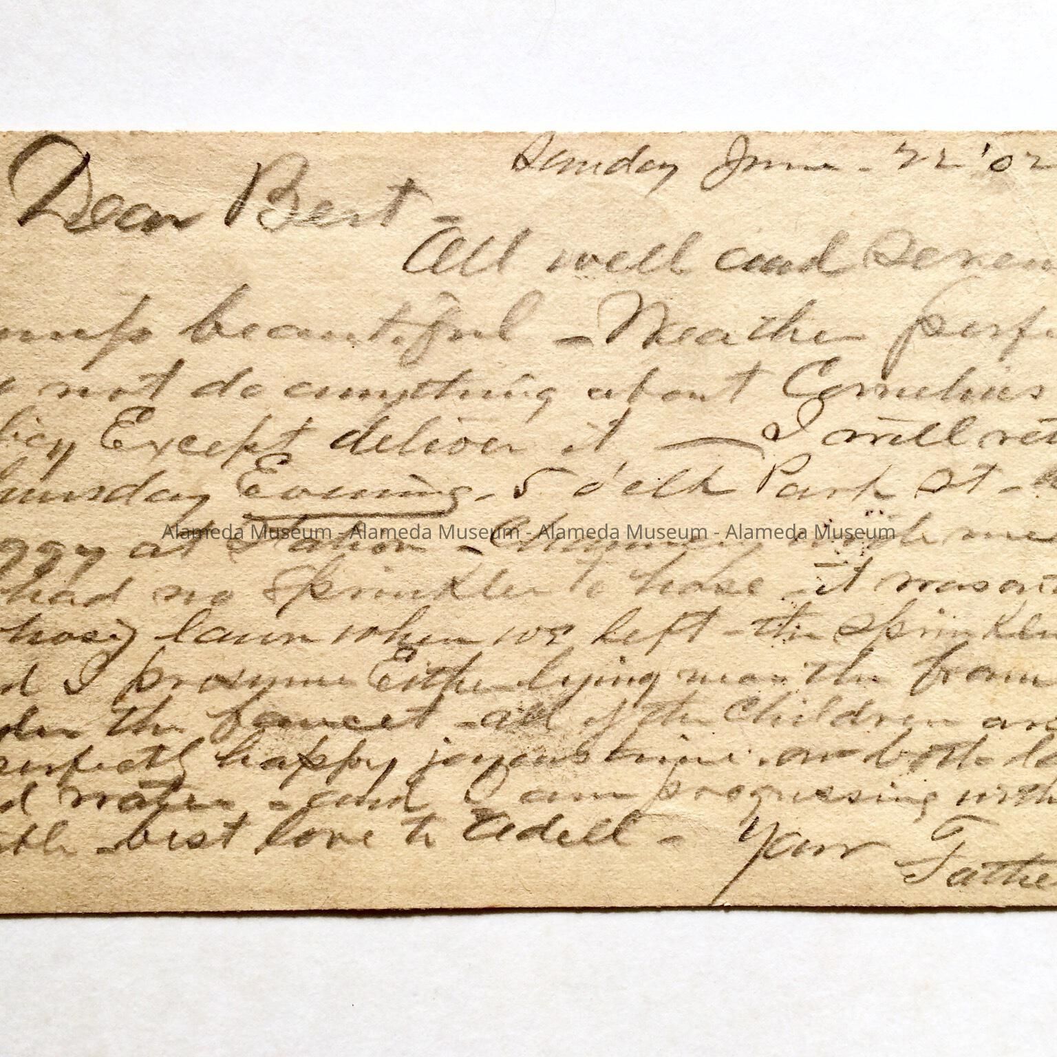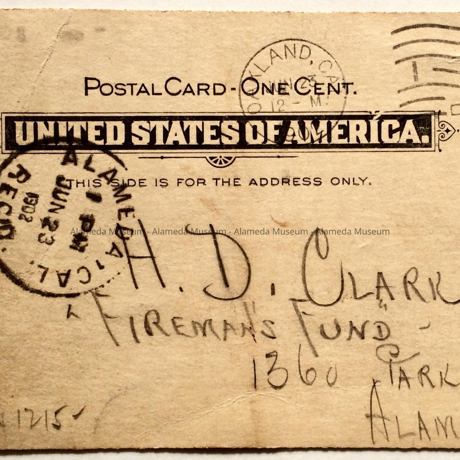 History of Object: Postcard addressed to H. D. Clark, Fireman's Fund Insurance, 1360 Park St., Alameda, 1904, from R. Frank Clark, father of H. D. Clark.