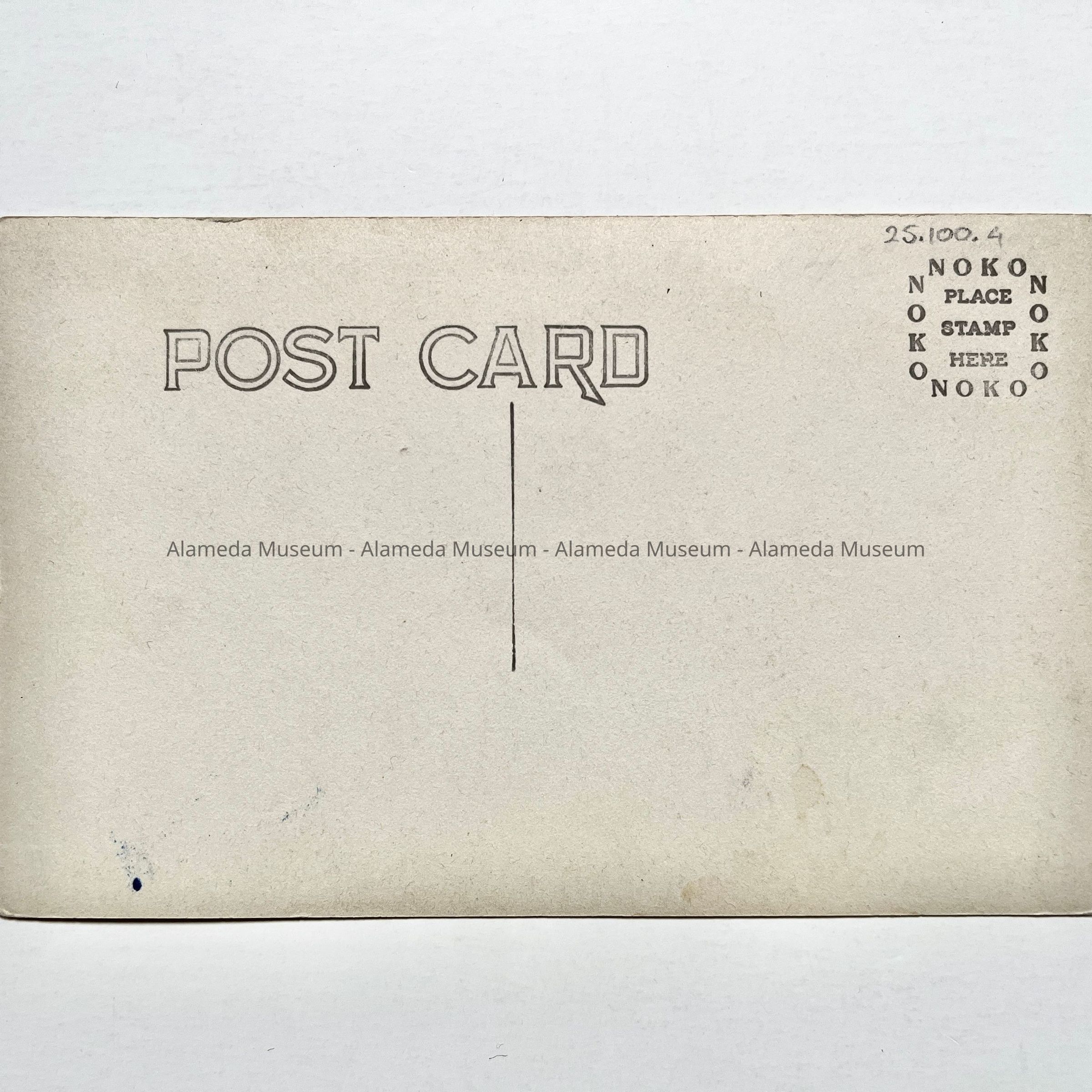 Description: Postcard of a black-and-white photograph of 2 pillars and a building behind with in the glass windows visible: 'To Alameda'. Legend on the front: Oakland - Alameda Tube #14'. Publisher: Noko.