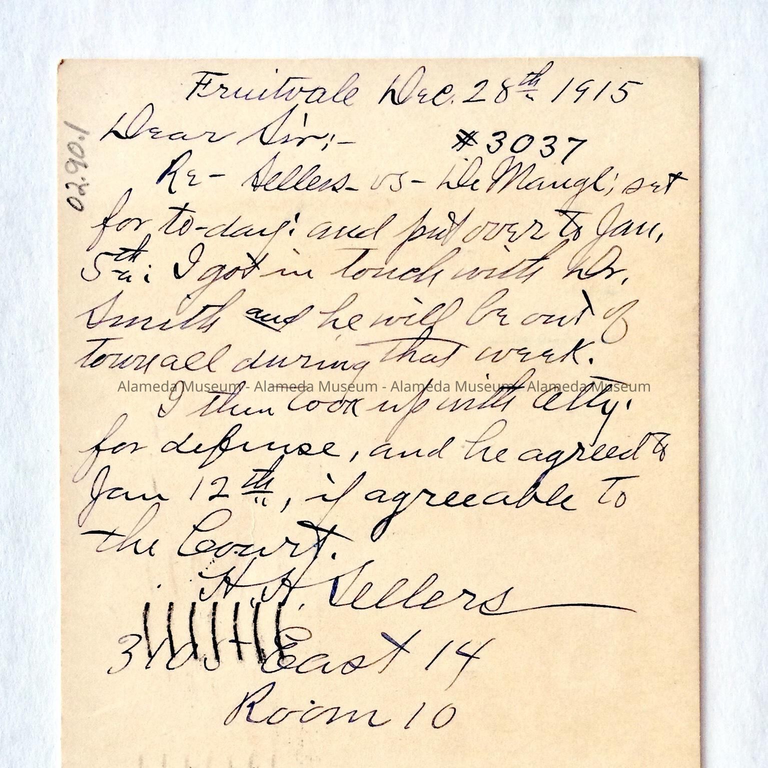 A POSTAL CARD ADDRESSED TO JUDGE ELMER C JOHNSON, WATERWORKS BUILDING, PARK STREET, ALAMEDA, CALIF., REQUESTING A DELAY OF A COURT TRIAL.