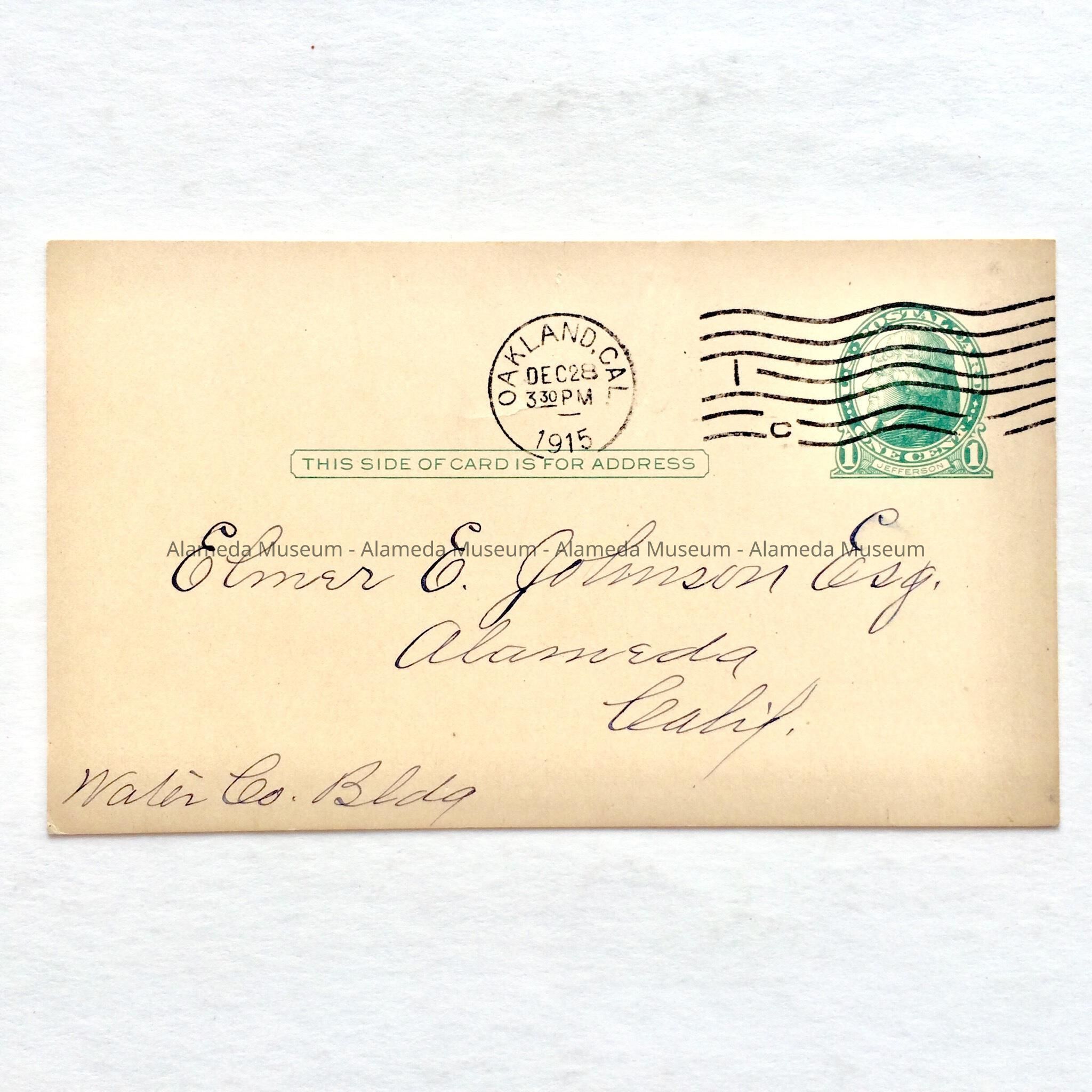 Postal Card addressed to Judge Elmer C. Johnson, Waterworks Building, 1915Entry/Object ID