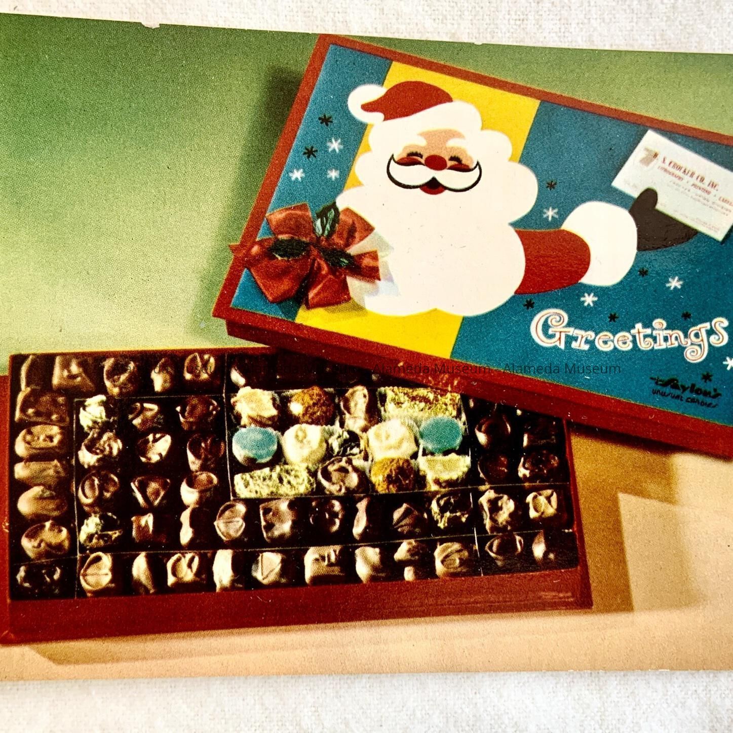 A POSTCARD ILLUSTRATED WITH CHOCOLATES MANUFACTURED BY THE MISS SAYLOR'S CHOCOLATES, INC., ALAMEDA. IT WAS LOCATED AT THE CORNER OF ENCINAL AVENUE AND PARK STREET. THE POST CARD ALSO INCLUDES VARIOUS PRICES FOR INDIVIDUAL SIZED BOXES OF CANDIES.