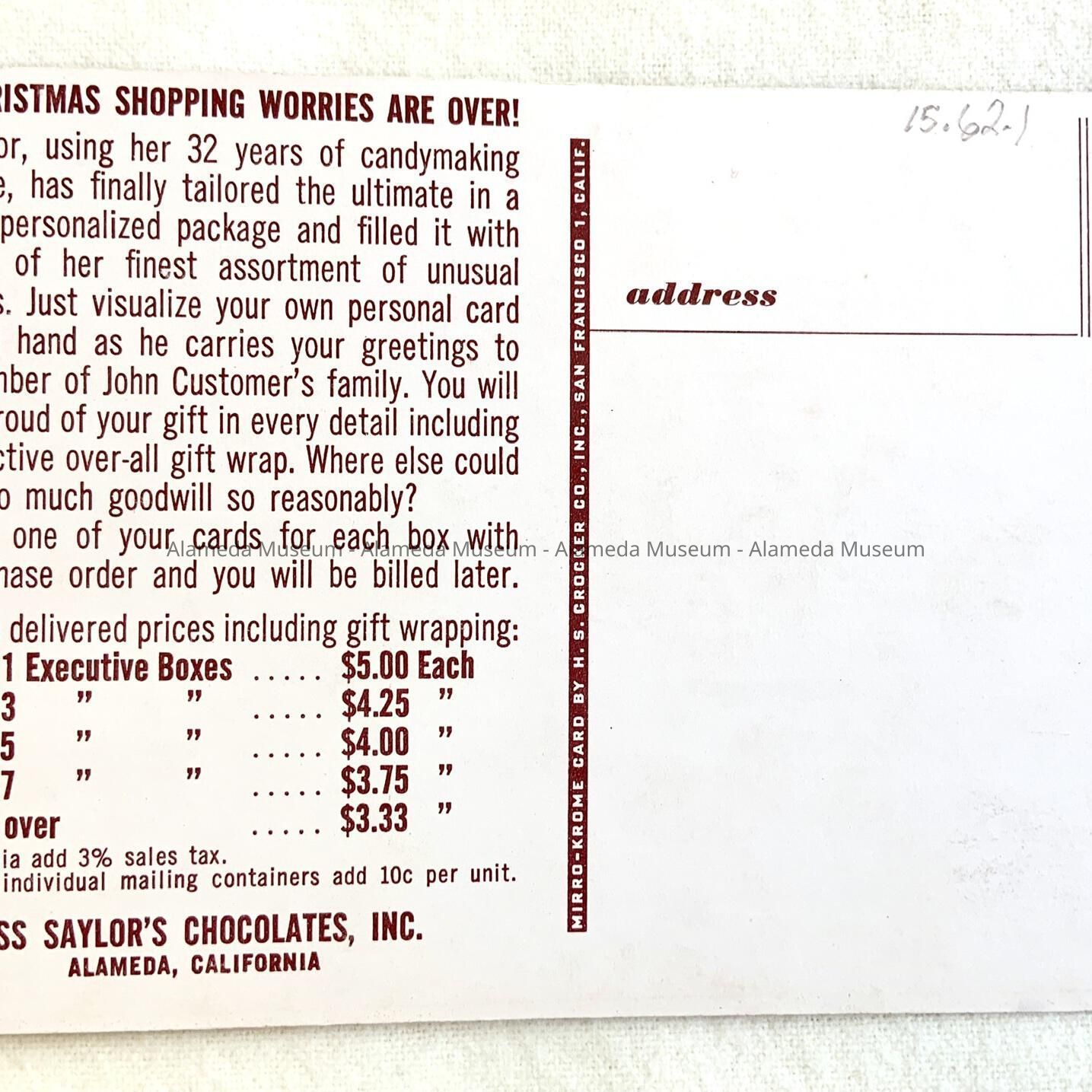 Postal card advertising Miss Saylor's Chocolates, Inc., prior 1992Entry/Object ID