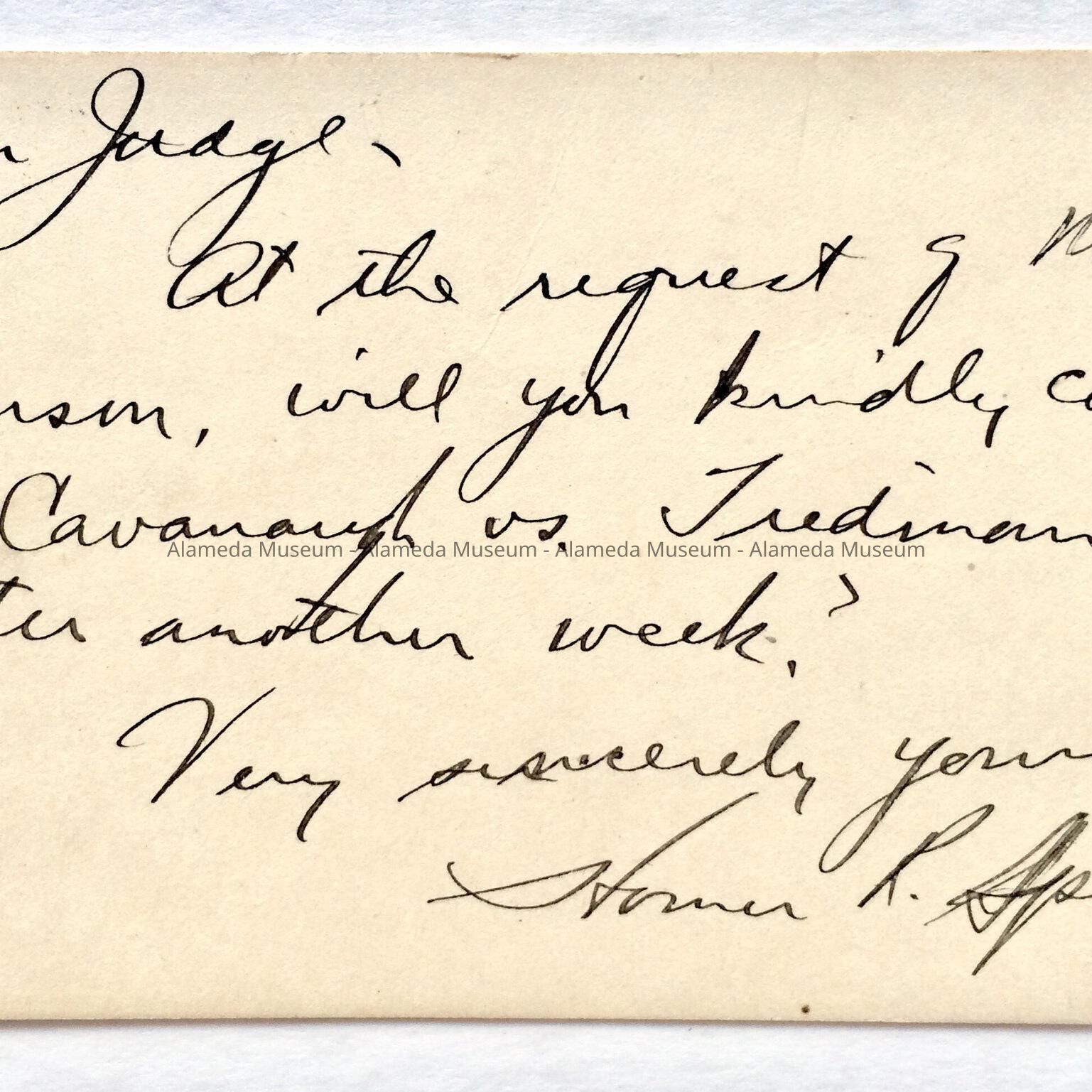 A POSTAL CARD ADDRESSED TO JUDGE ELMER E JOHNSON, WATERWORKS BUILDING, ALAMEDA. MESSAGE REQUESTED CONTINUANCE OF LEGAL PROCEEDINGS AND SIGNED BY HOMER R SPENCE.