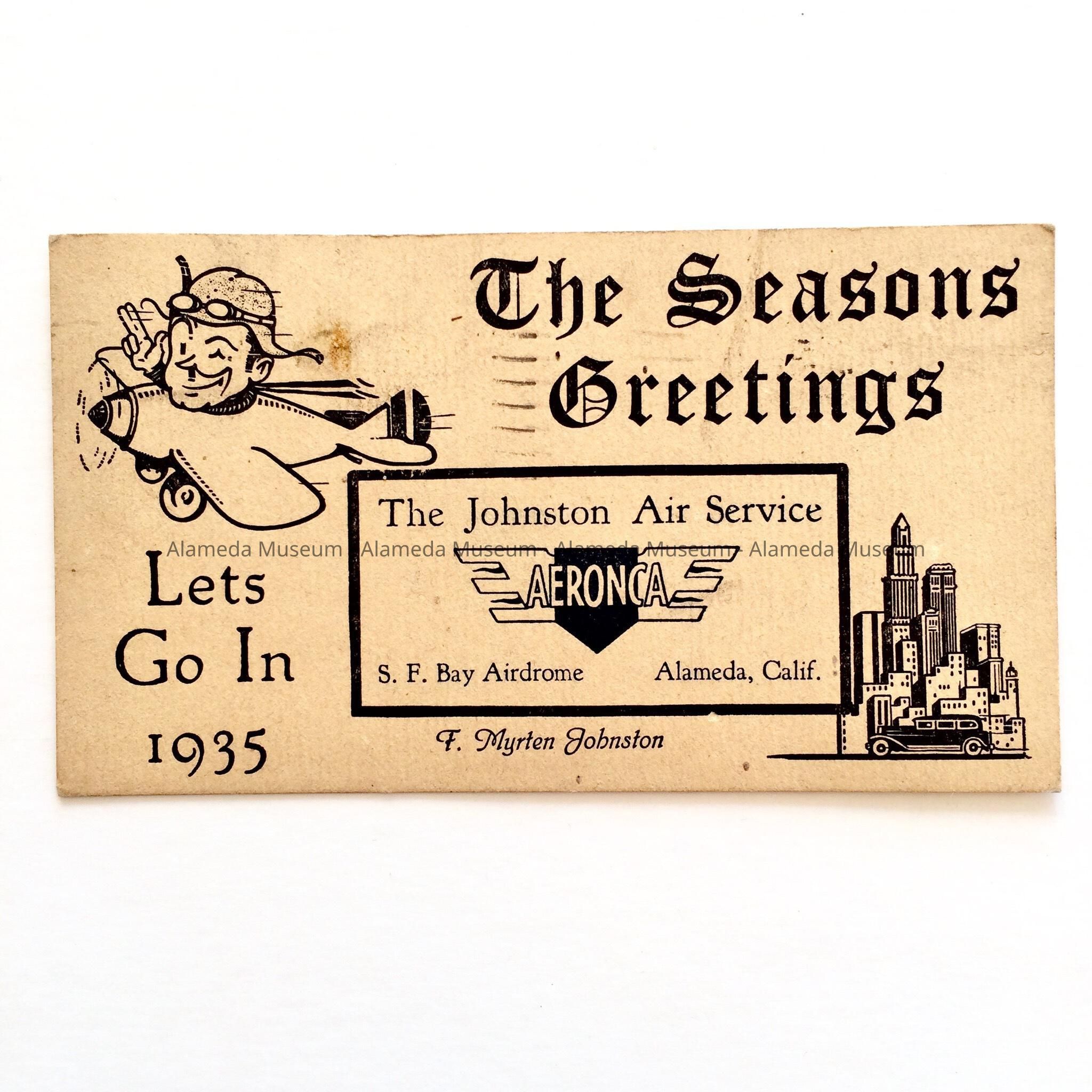 History of Object: Postal Season's Greetings card advertising the Johnston Air Service, Aeronca, S.F. Bay Airdrome, Alameda, Calif., owner F. Myrten Johnston.
