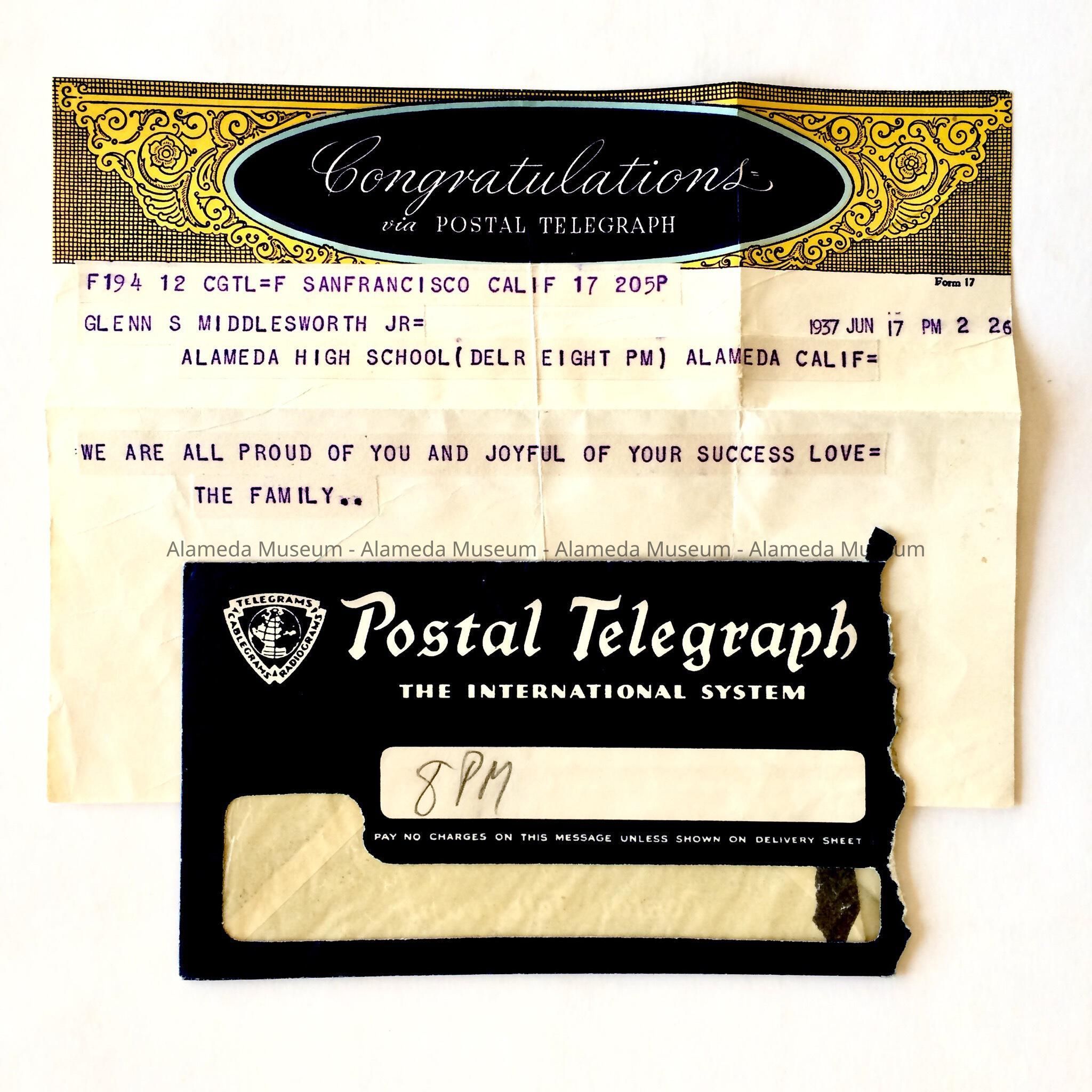 History of Object: Telegram addressed to Glenn S. Middlesworth, Jr., Alameda High School, from his family, upon his graduation, June 17, 1937.