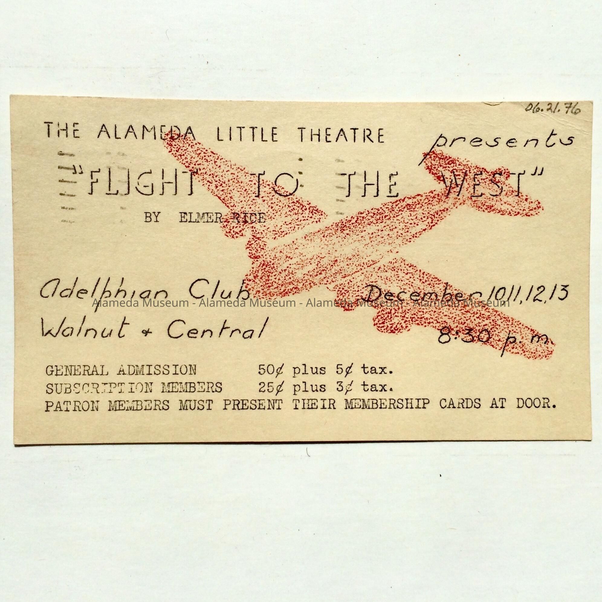 Postcard about 'Flight to the West' performance by Alameda Little Theatre, 1941Entry/Object ID