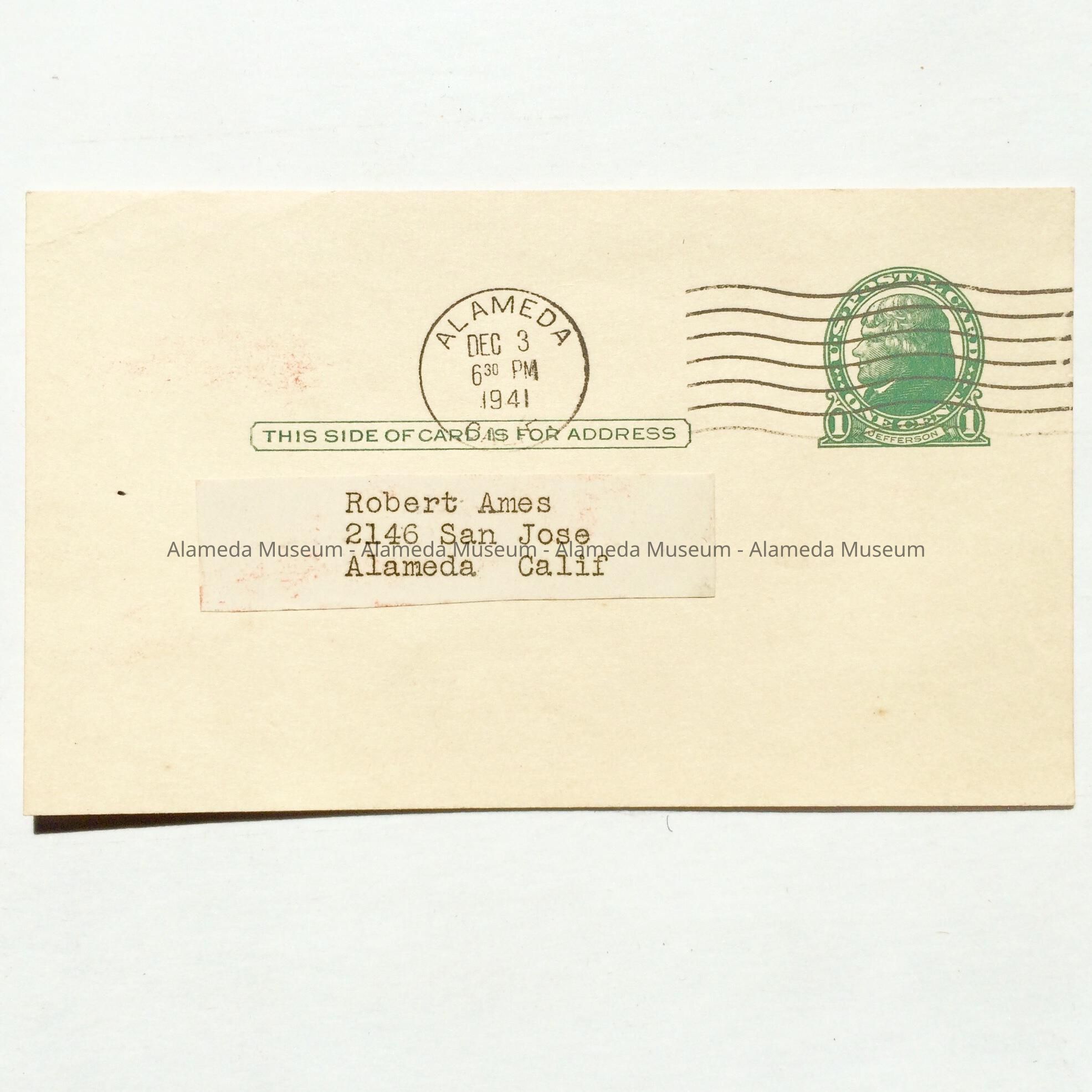 A POSTCARD ADDRESSED TO ROBERT AMES CONCERNING THE PRODUCTION PRESENTED BY THE ALAMEDA LITTLE THEATRE. THE PLAY WAS ENTITLED, "FLIGHT TO THE WEST," AND WAS PERFORMED AT THE ADELPHIAN CLUB IN 1941.