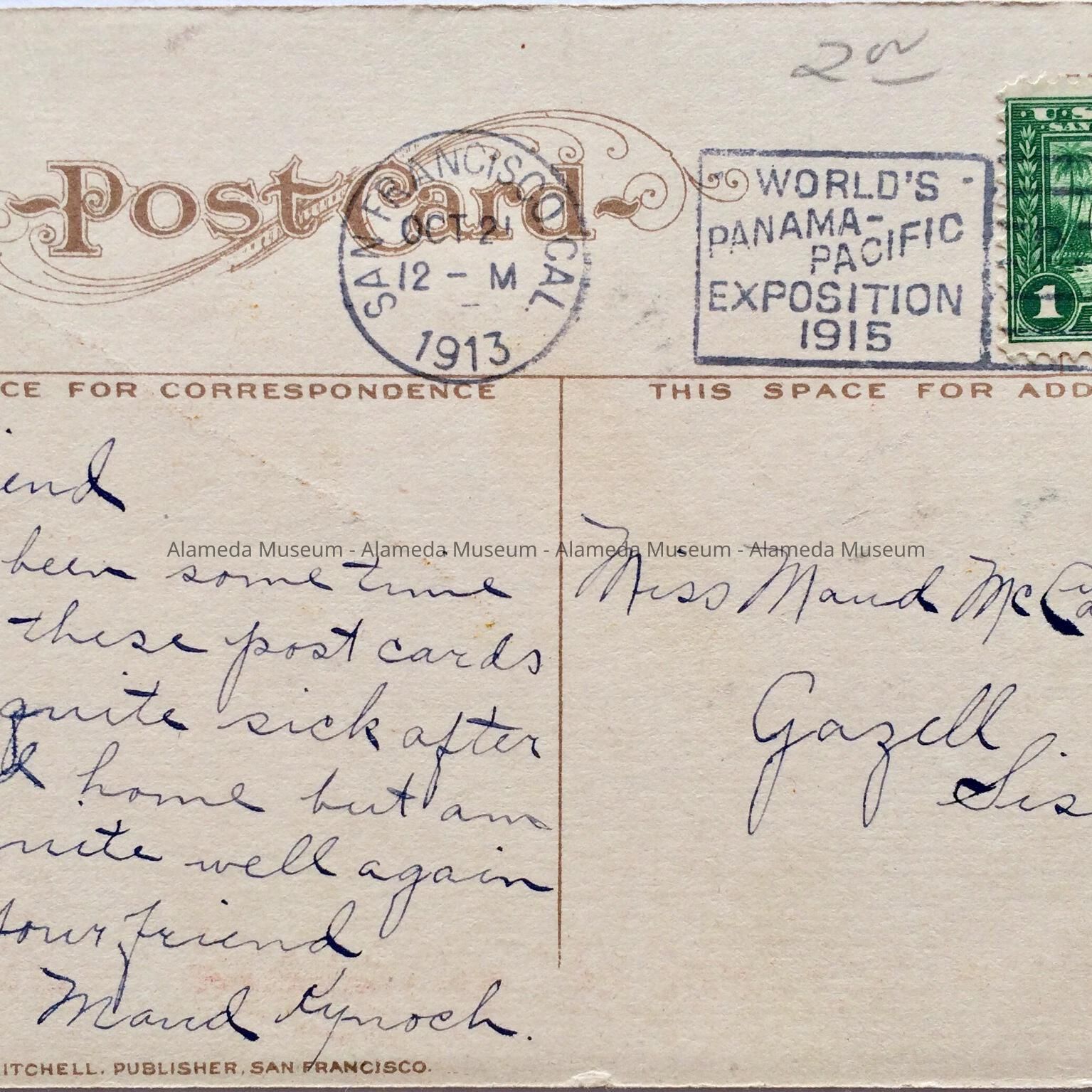 History of Object: Postcard depicting the Alameda Free Library, post marked Oct 21, 1913. Found in an antique shop in the Gold Country.