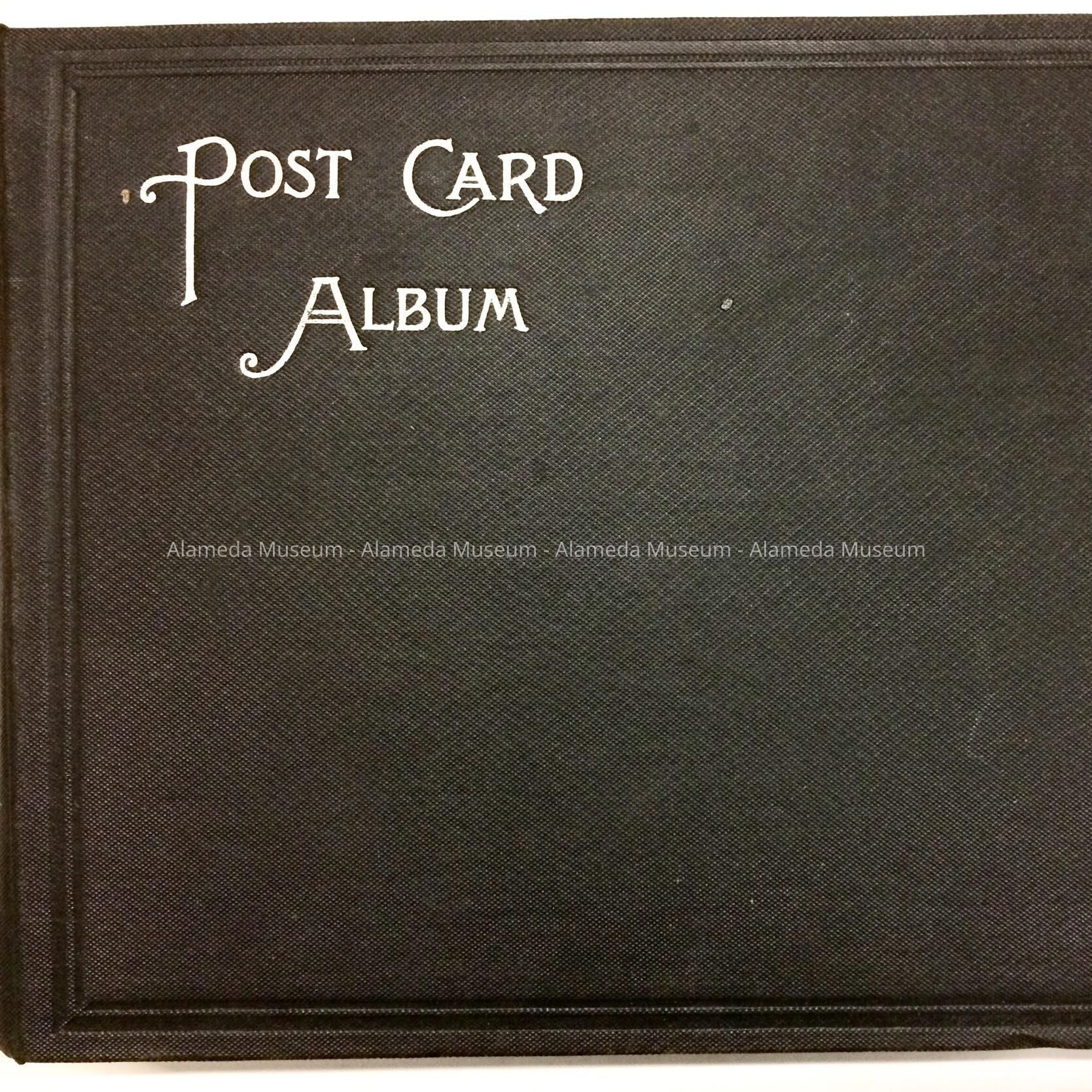 DESCRIPTION: A HARD-BOUND POSTCARD ALBUM WITH SLOTTED PAGES IN BLACK-COLORED PAPER, WHICH ARE RECEPTACLES FOR INDIVIDUAL POSTCARDS. THE ALBUM COVER IS IN BLACK-COLORED BUCKRAM AND HAS INCISED CAPTION, "POSTCARD ALBUM" IN WHITE-COLORED TYPE.
