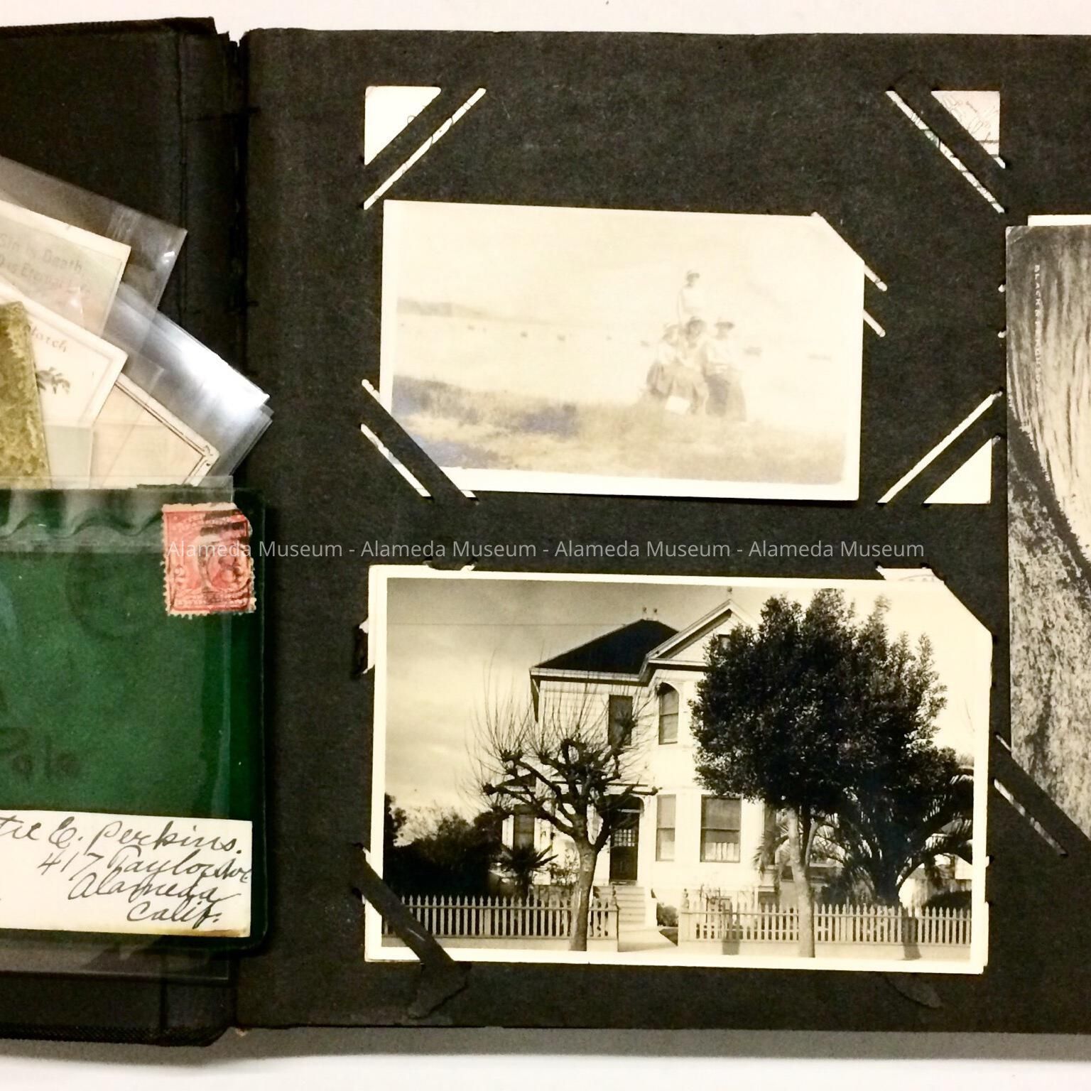 HISTORY OF OBJECT: A COLLECTION OF POSTCARDS IN AN ALBUM SENT TO LOTTIE PERKINS OF 417 TAYLOR AVENUE, ALAMEDA. LOTTIE WAS THE AUNT OF THE DONOR AND WAS A LONGTIME TEACHER IN THE ALAMEDA UNIFIED SCHOOL DISTRICT, ASSIGNED TO LONGFELLOW SCHOOL.