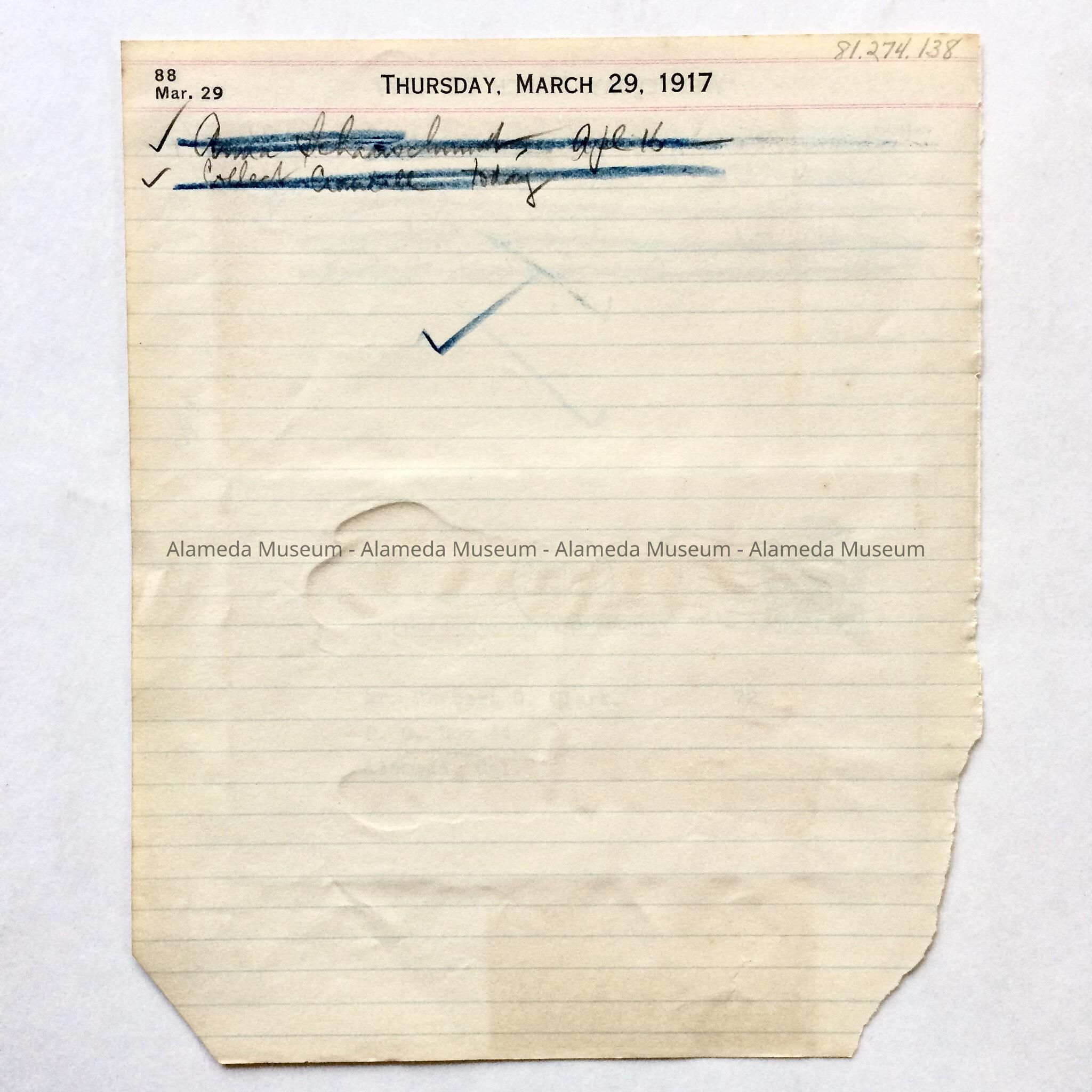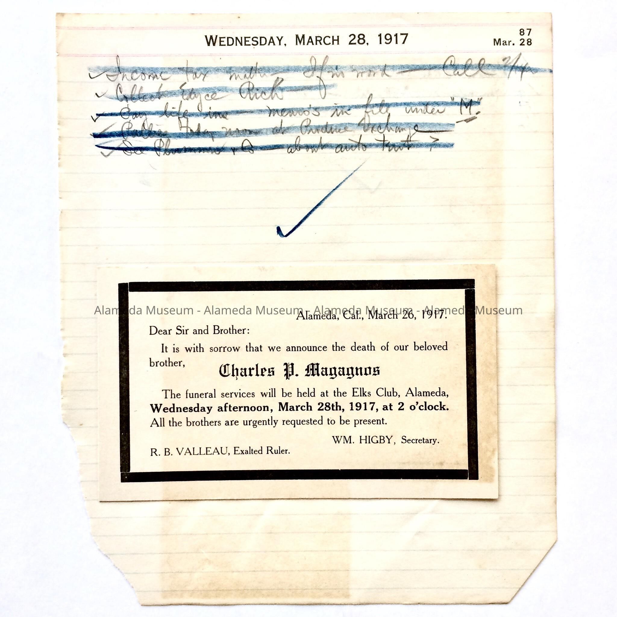 History of Object: Postcard announcing the death of Charles P. Magagnos, whose funeral was held at the Elks Club building, Alameda, Wednesday, March 28th, 1917. The announcement was sent out by Wm. Tigby, Secretary of the Elks Club.