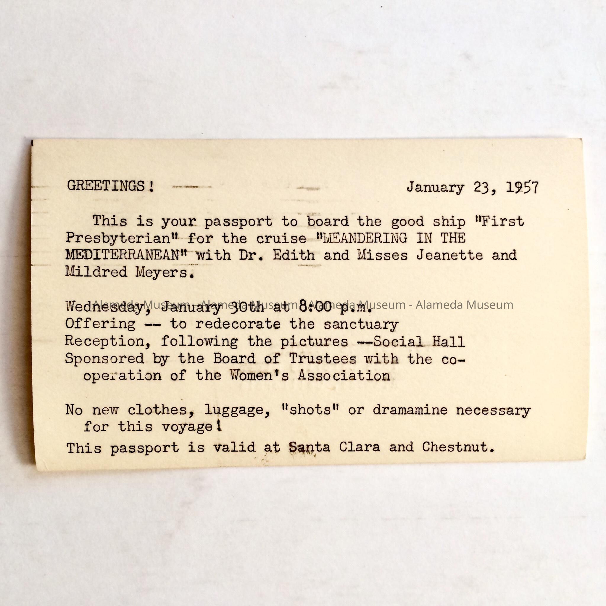 History of Object: Post card (advertising), announcing film presentation "Meandering in the Mediterranean", given by the Meyers sisters, for the benefit of the redecoration of the sanctuary, First Presbyterian Church, Santa Clara Ave., & Chestnut St., 1957.
