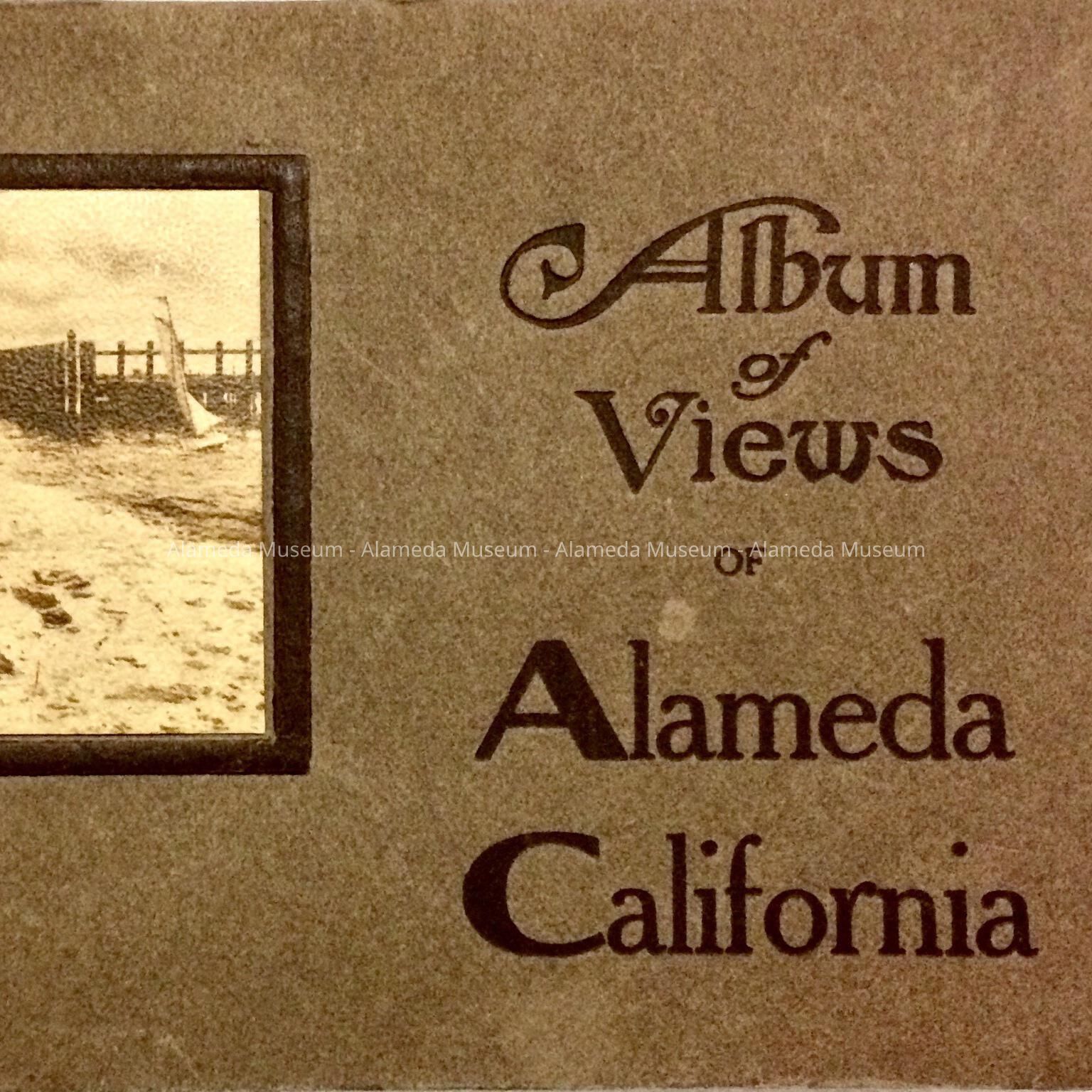 Description: A brown soft cover booklet with the caption, "Album of Views of Alameda, California". The cover has a sepia colored reproduced photograph of the entrance to the Alameda Mole.