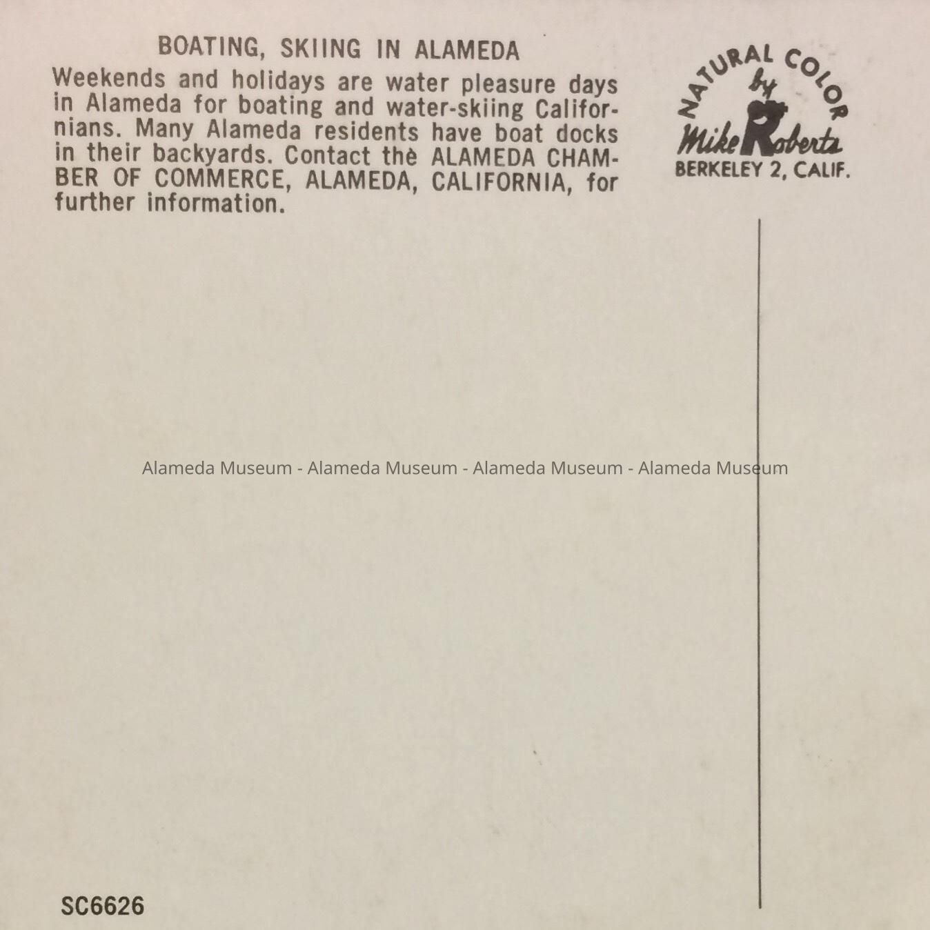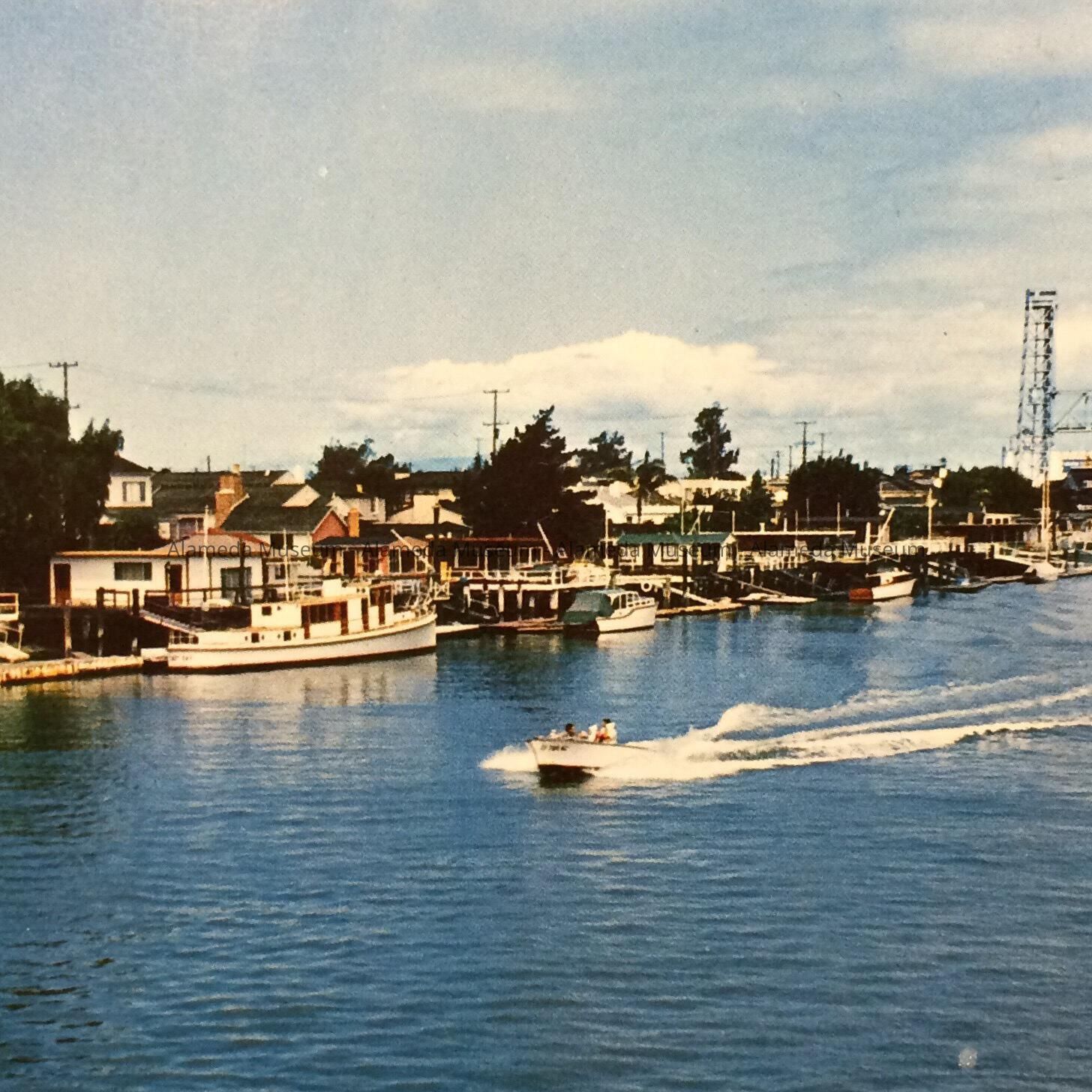 Scenic post card depicting homes and boating, estuary shoreline, east of the Fruitvale Bridge.