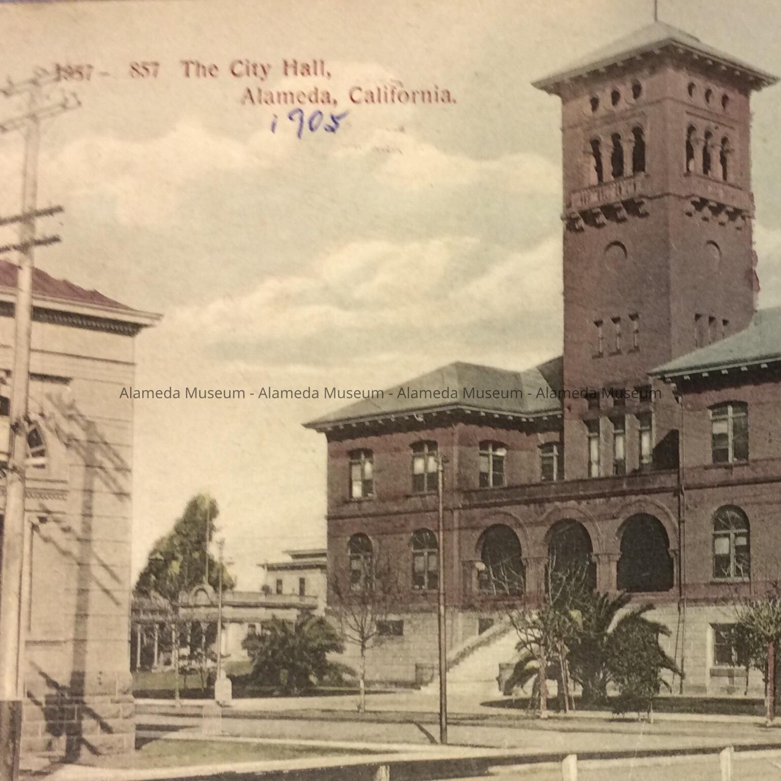 POST CARD DEPICTING THE ALAMEDA CITY HALL. TO THE LEFT IS THE RECENTLY CONSTRUCTED ALAMEDA FREE LIBRARY.