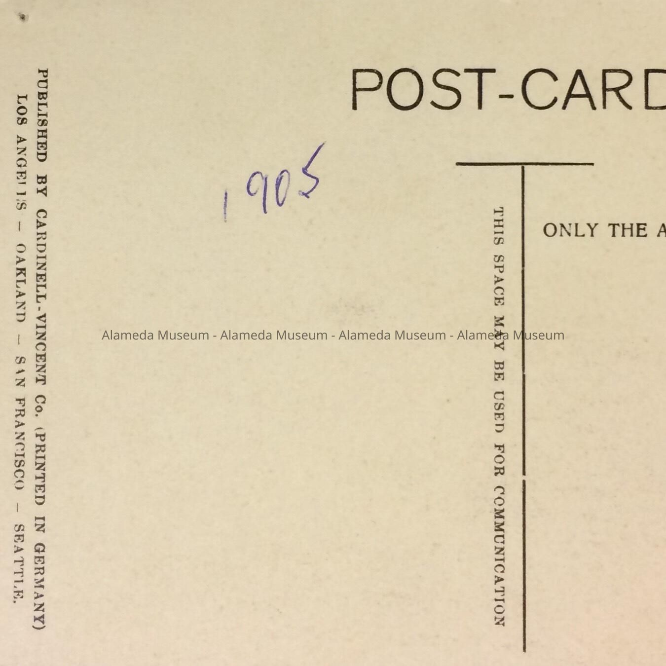 PHOTOLITHOGRAPHIC POST CARD THAT APPEARS TO BE HAND-COLORED. CARD HAS BOLD-PRINTED CAPTION, "THE CITY HALL, ALAMEDA, CALIF." CARDINELL-VINCENT CO., PUBLISHER.. L 3-1/2" X W 5-1/2"