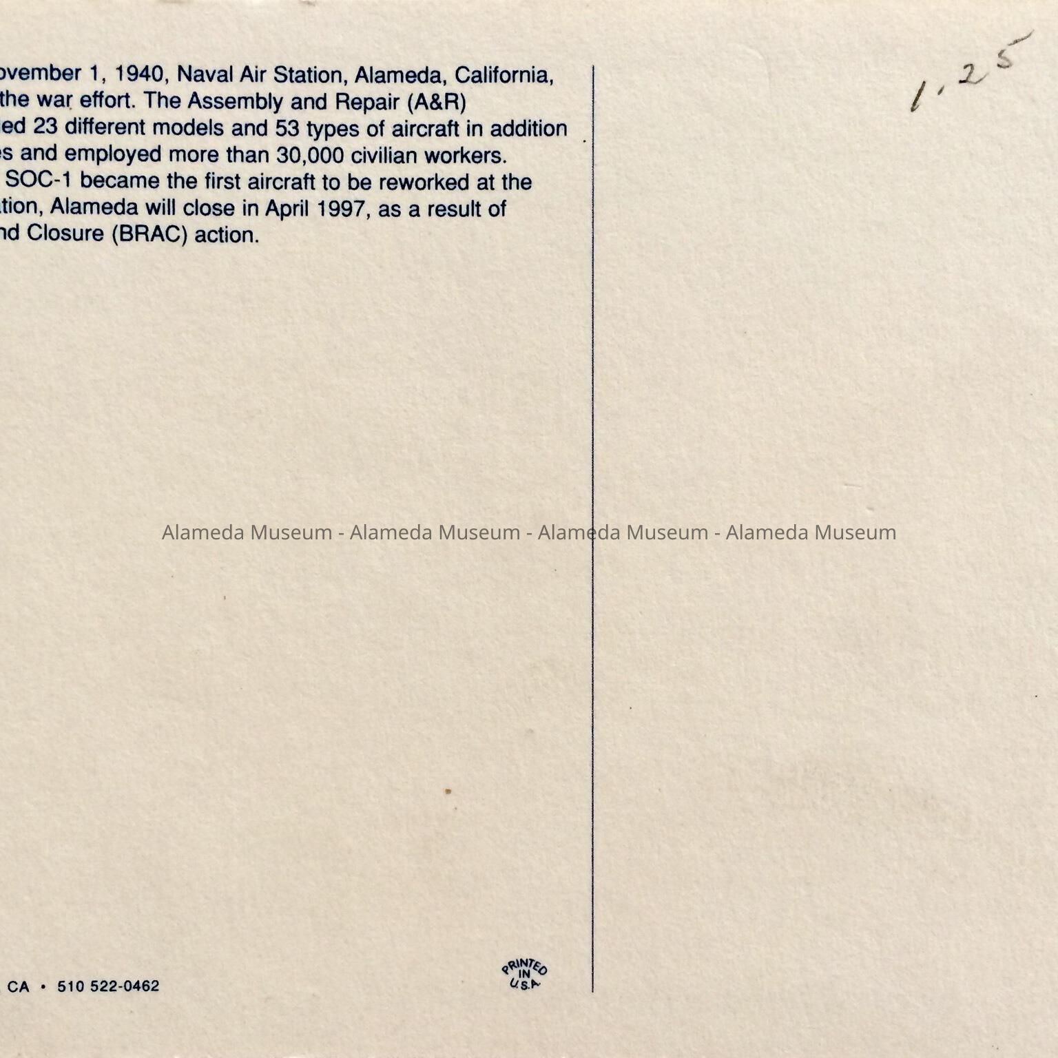 History of Object: Postcard, part of a series commemorating Naval Air Station, Alameda, when it was slated to be closed, in April, 1997, as result of Base Realignment and Closure (BRAC) action.