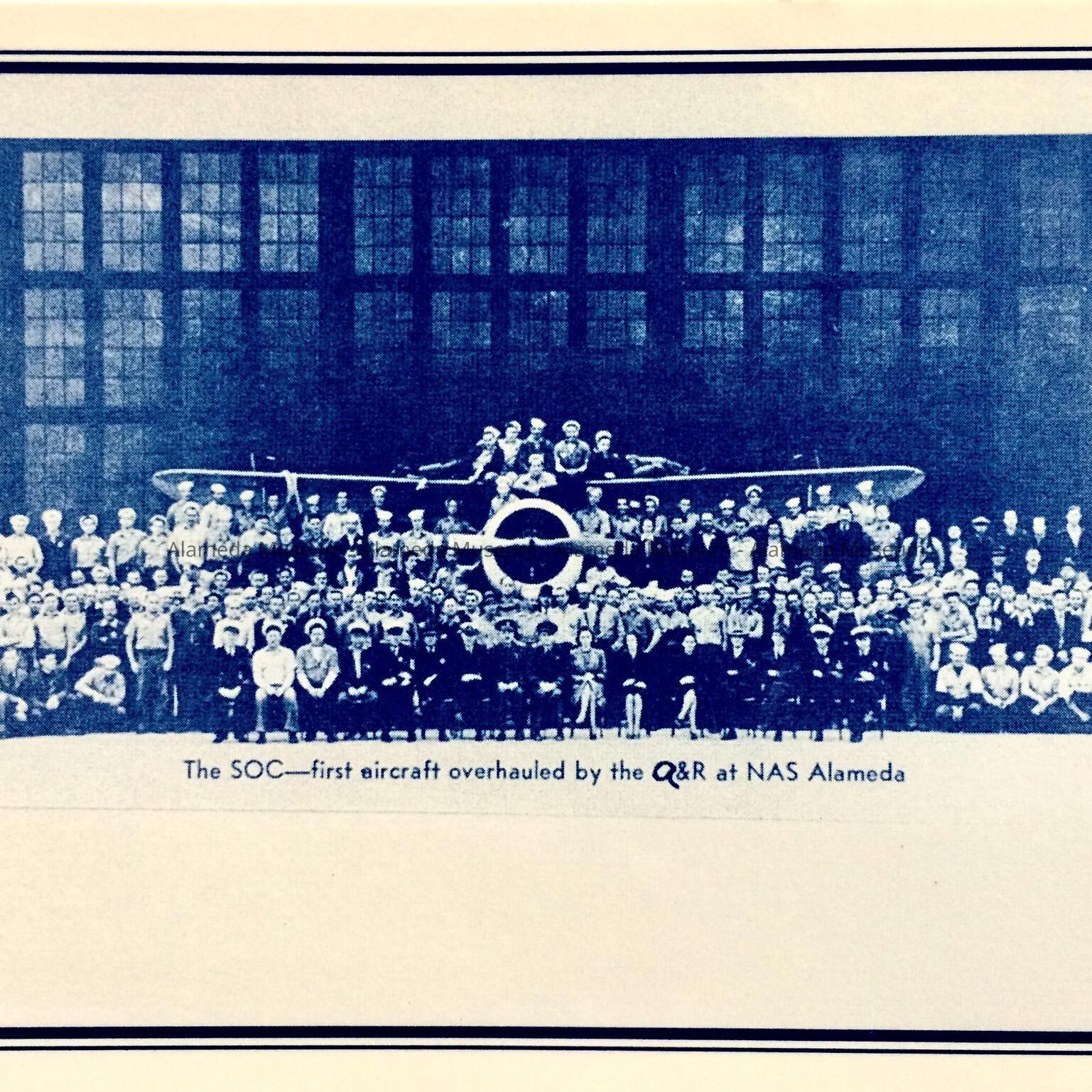 Description: Uncirculated, blue-tinted postcard of a black-and-white of a crowd of people with an aircraft in front of large multi-mullioned windows. Caption: The SOC- first aircraft overhauled by the Q&R at NAS Alameda. Verso has more information. Published by Excel Graphics, Alameda.