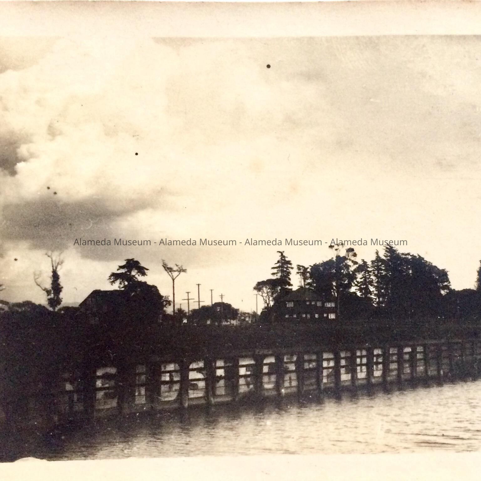 Description: Uncirculated 'real' postcard, of black-and-white photo depicting a moderately narrow channel of water, a shoreline, reinforced with wooden or metal boards, which prominently advertise 'Reidsieck-plug' (tobacco), with dark-silhouetted houses, trees, and telegraph poles. Verso has handwritten in pencil: 'Alameda'.