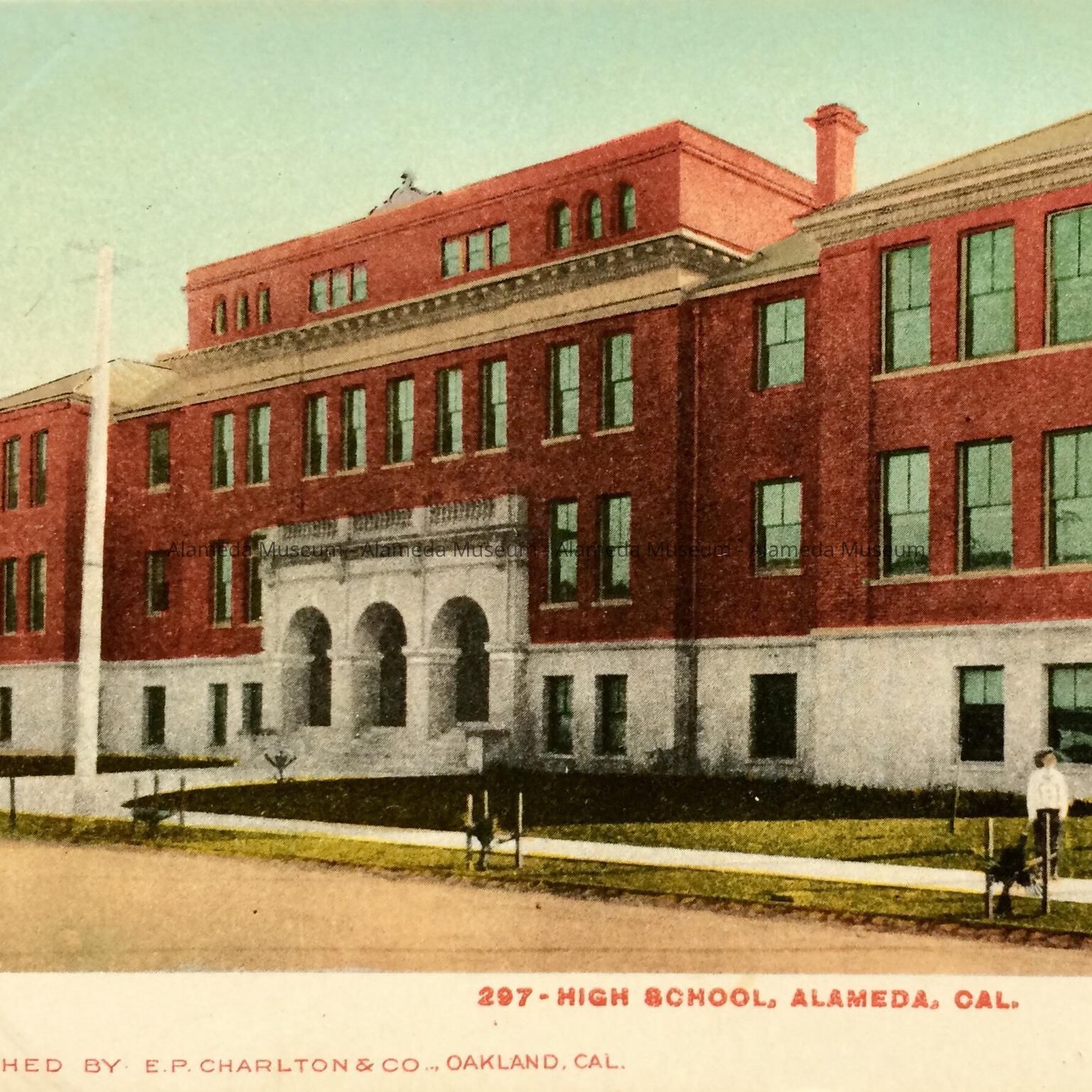 POSTCARD DEPICTING THE ORIGINAL ALAMEDA HIGH SCHOOL AT WALNUT STREET AND CENTRAL AVENUE, SINCE DEMOLISHED.