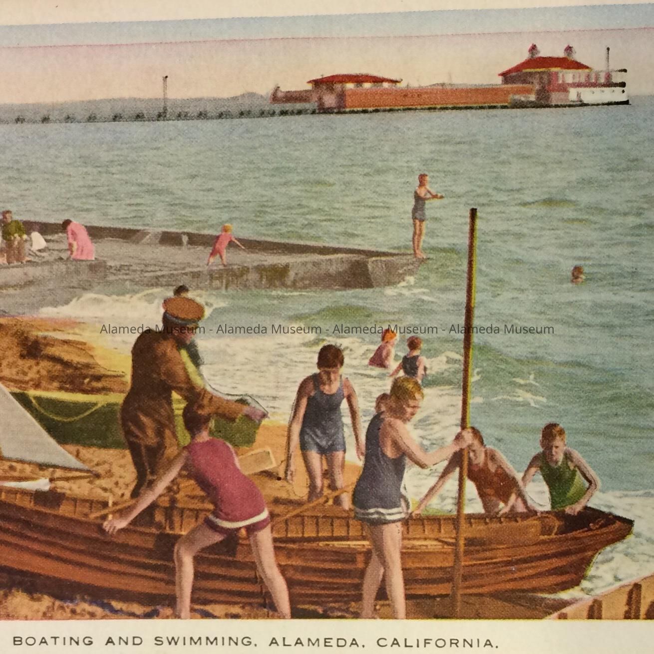 COLORED PHOTOLITHOGRAPHIC POST CARD, WITH CAPTION, "BOATING AND SWIMMING, ALAMEDA, CALIF." PACIFIC NOVELTY CO., SF, PUBLISHERS. UNCIRCULATED. L 3-1/2" X W 5-1/2"
