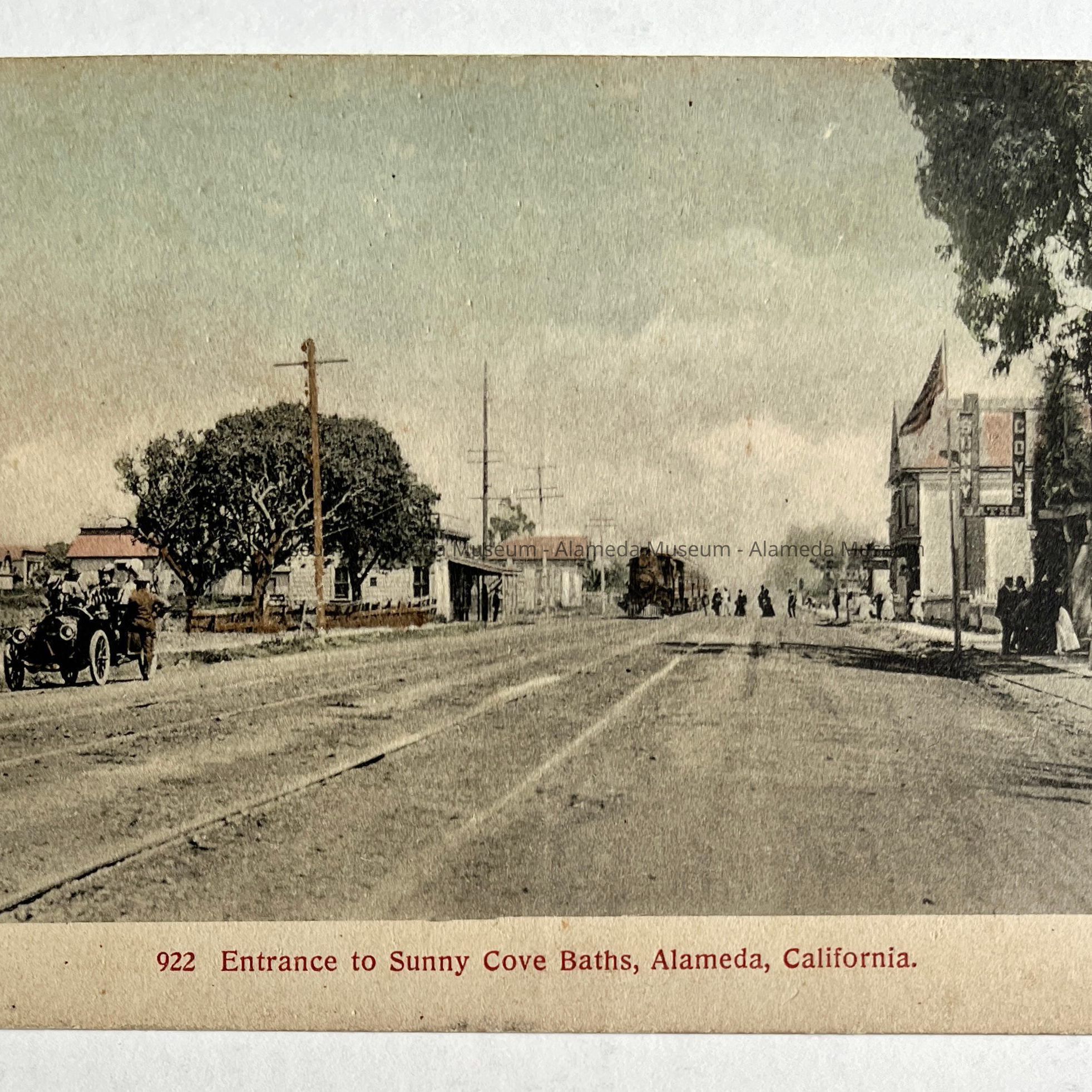 Description: a postcard, uncirculated, of a hand-colored black-and-white photo, title in red in a white strip at the bottom: '922 Entrance to Sunny Cove Baths'. Visible is an unpaved street, with tracks running through and a steam train, one open car, and a flag pole with attached U-shaped sign stating 'Sunny Cove Baths' and a cluster of people underneath. Behind this is one three-story building with an awning and people crossing the street to the train. Verso states it was published by Cardinell-Vincent Co., printed in Germany.