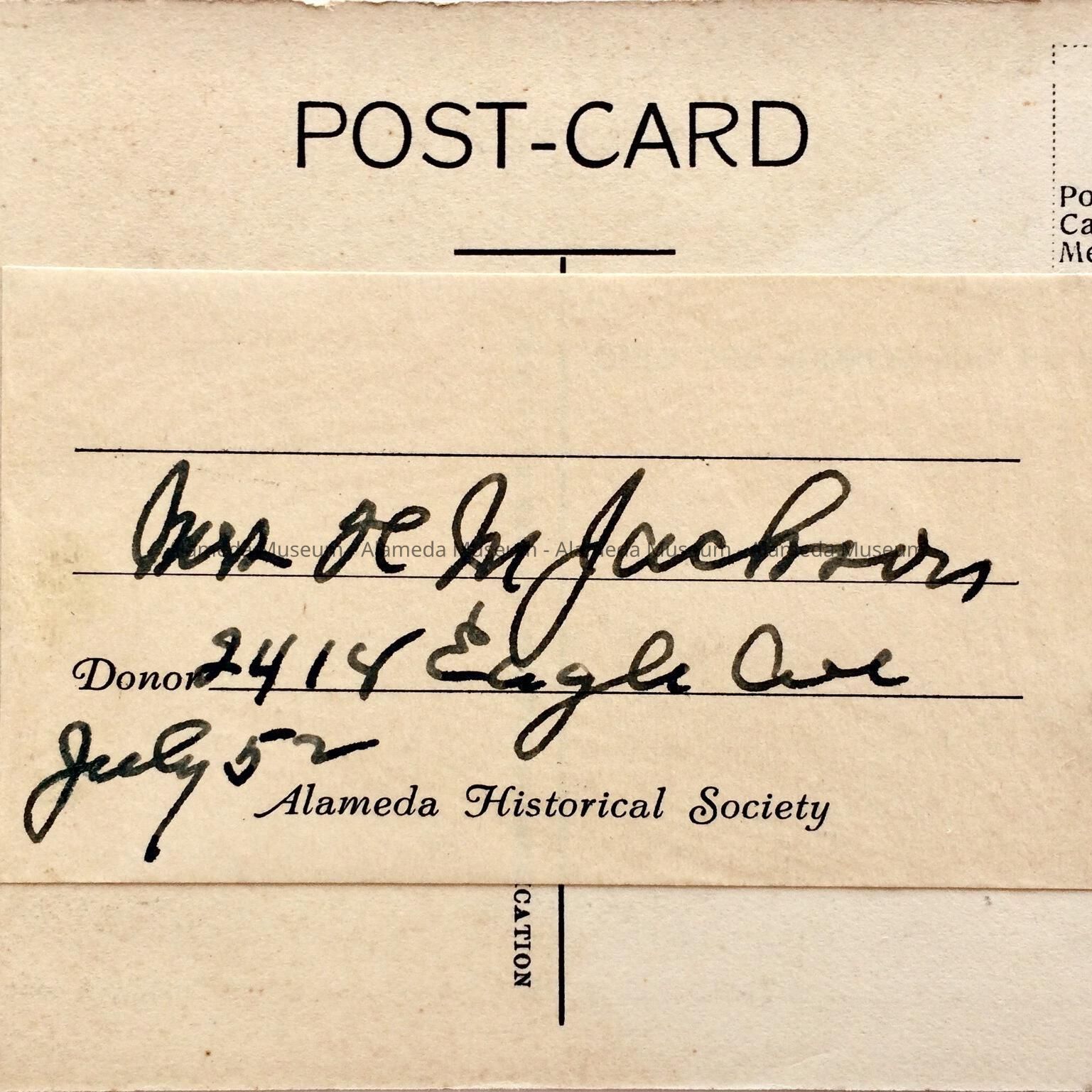 CARD WAS GIVEN IN 1952 TO THE ALAMEDA HISTORICAL SOCIETY AND NOT CATALOGED AT THAT TIME.