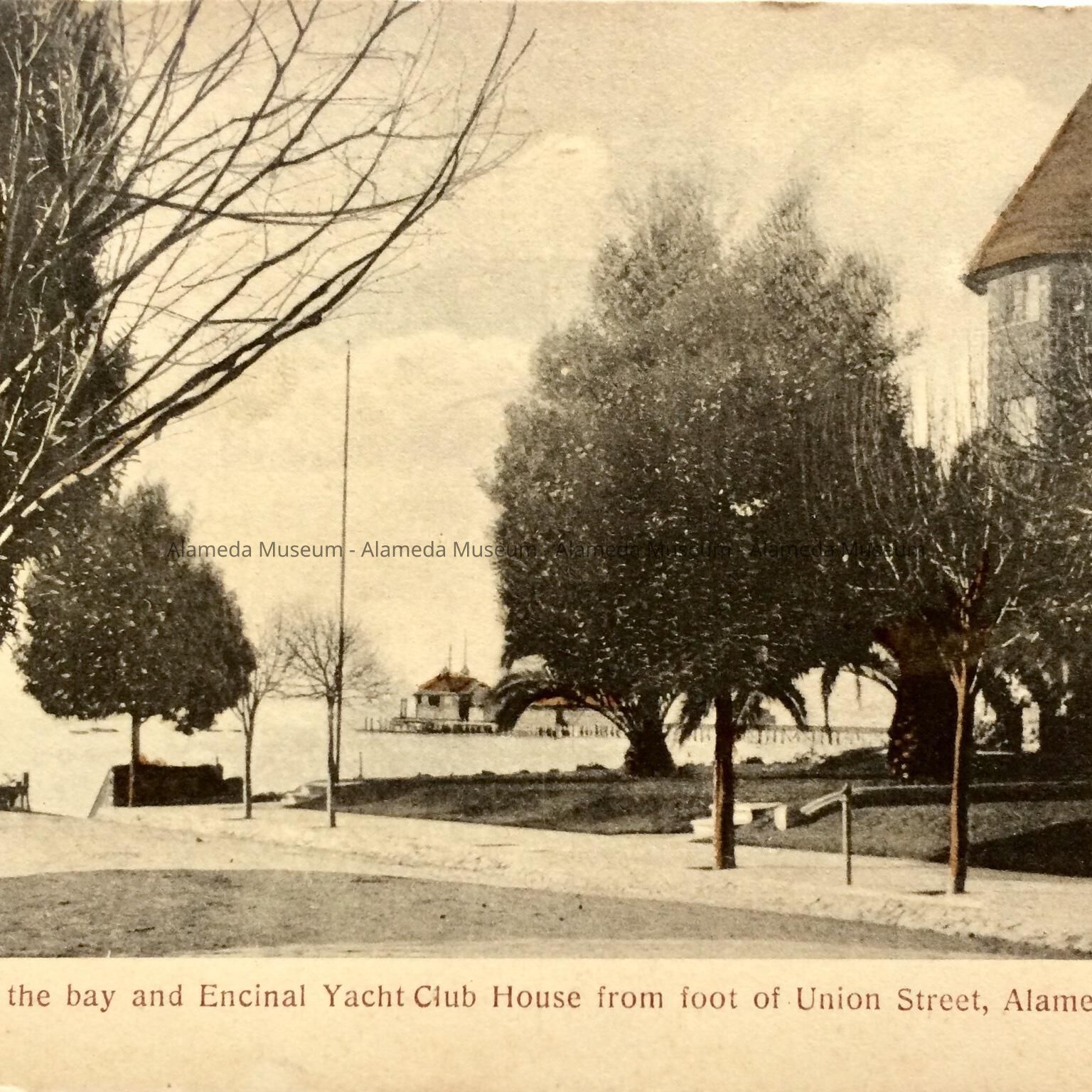 POSTCARD DEPICTING THE FOOT OF UNION STREET IN ALAMEDA. TO THE RIGHT CAN BE SEEN THE CUPOLA, ETC. OF THE LEONARD MANSION @ 891 UNION STREET. IN THE DISTANCE IS THE ENCINAL YACHT CLUB.