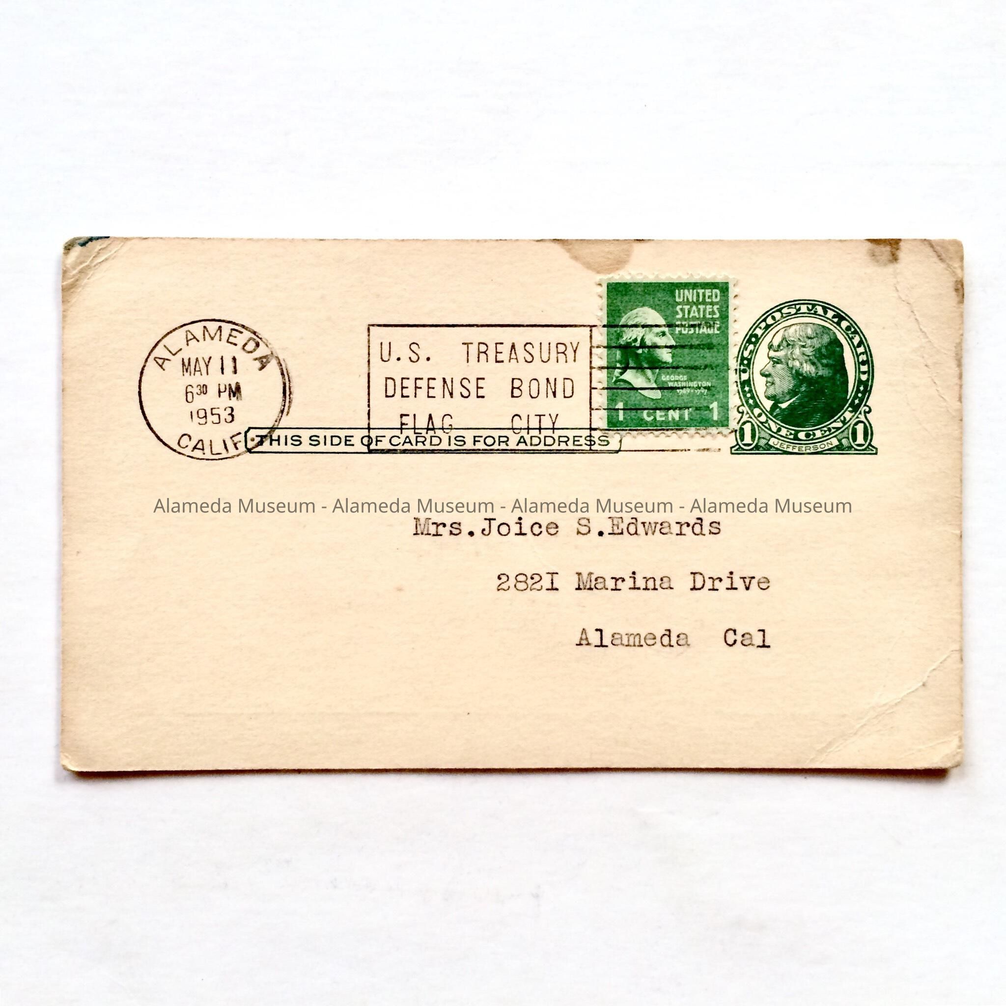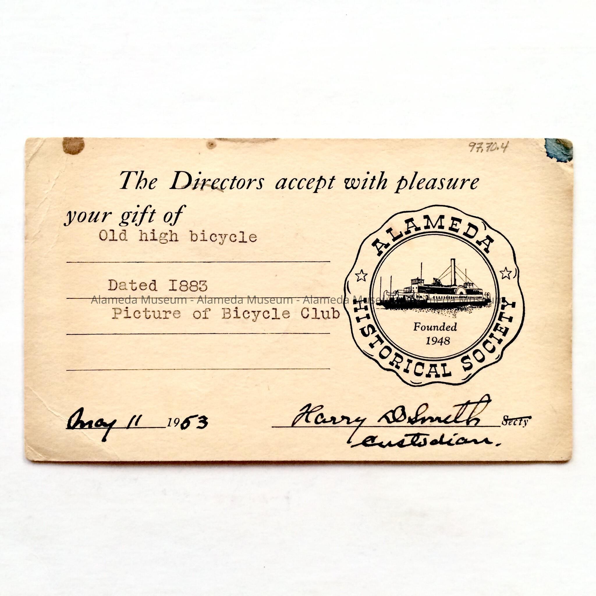 HISTORY OF OBJECT: POST CARD ADDRESSED TO MRS KATHLEEN EDWARDS, 2821 MARINA DRIVE, ALAMEDA, CALIFORNIA --- ACKNOWLEDGING THE DONATION OF THE HIGH-WHEEL OR "ORDINARY" BICYCLE. PRESENTED TO THE ALAMEDA HISTORICAL SOCIETY. SIGNED BY THE FIRST CURATOR --- DR HENRY D SMITH --- OF THE MUSEUM.