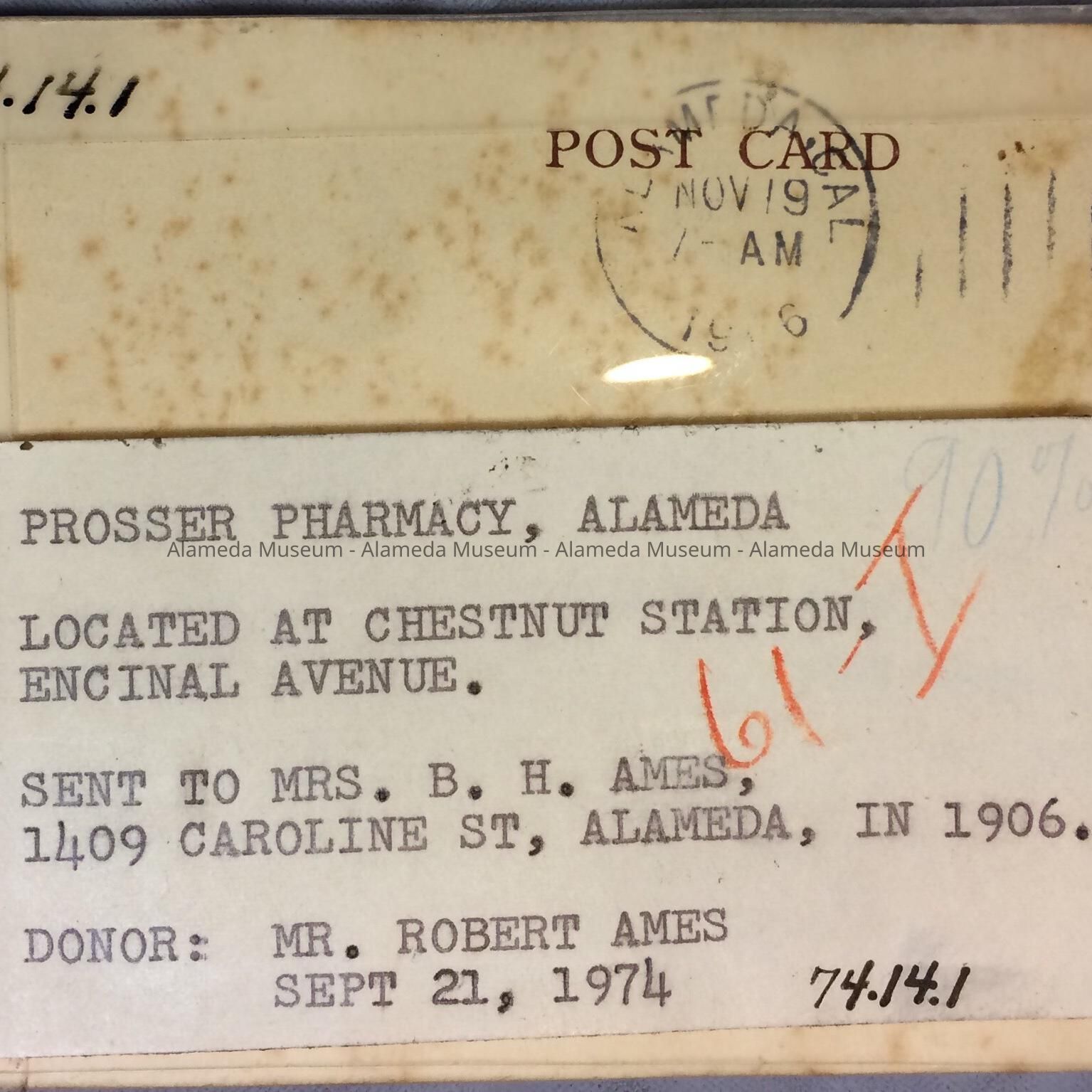 HISTORY OF OBJECT: PROSSER PHARMACY, LOCATED AT CHESTNUT STATION, ENCINAL AVENUE. SENT TO MRS. B. H. AMES., 1409 CAROLINE ST, ALAMEDA., IN 1906.