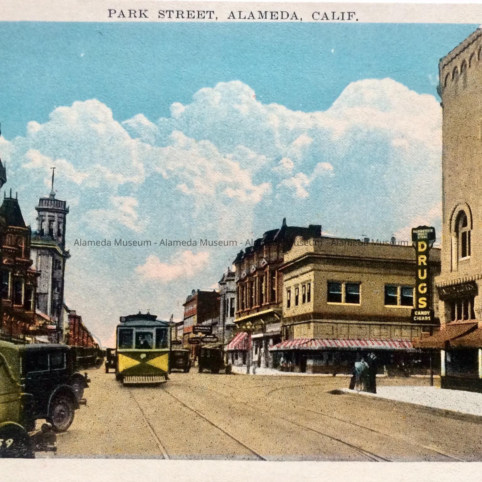 Photographic postcard depicting the intersection of Santa Clara Ave, and Park Street, in the late 1920's.