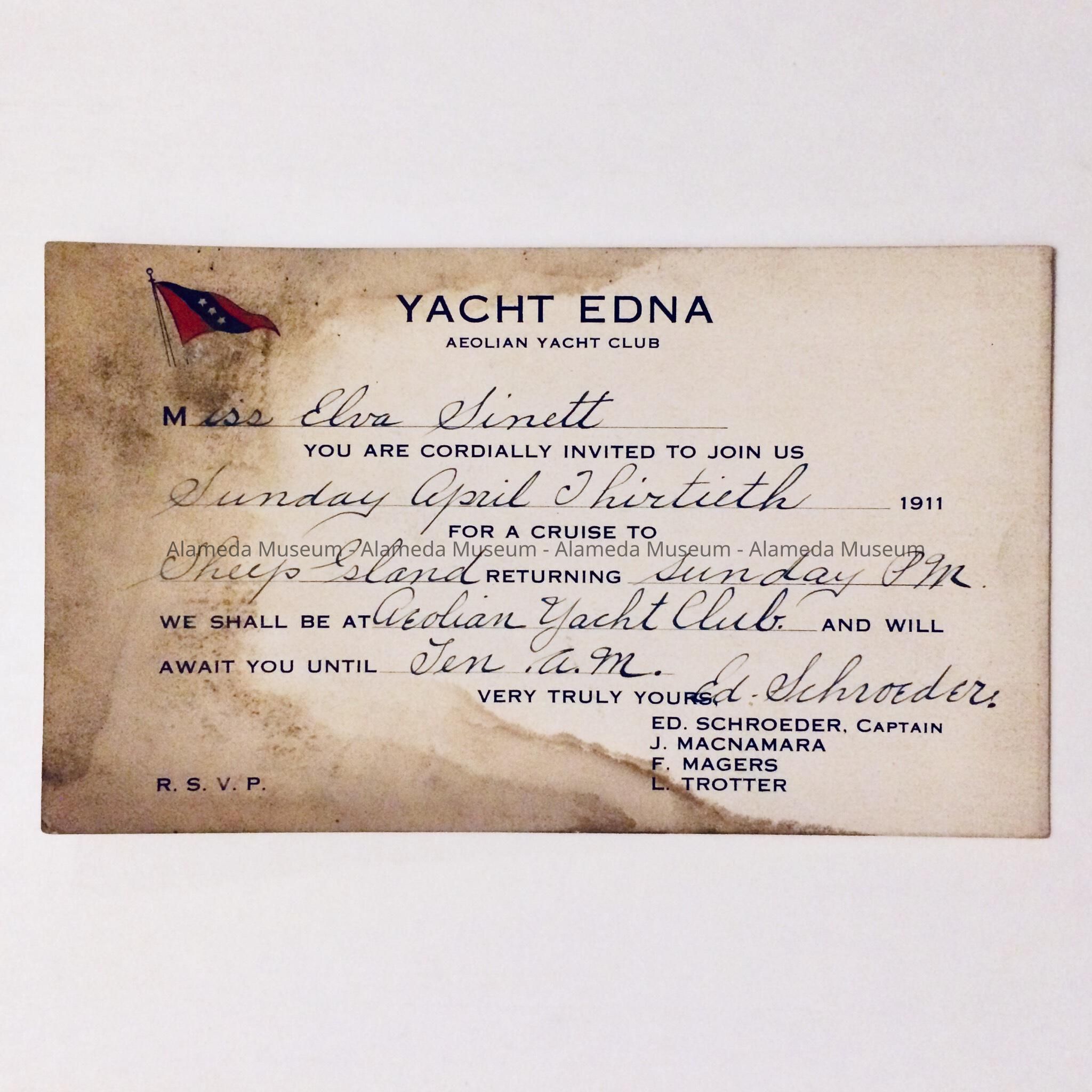 POSTCARD FROM "YACHT EDNA," AEOLIAN YACHT CLUB, TO MS ELVAH SINNETT, INVITING HER ON A CRUISE TO SHEEP ISLAND, ON SUNDAY, APRIL 13, 1911. THE EXCURSION WAS SCHEDULED TO DEPART FROM THE AEOLIAN YACHT CLUB.