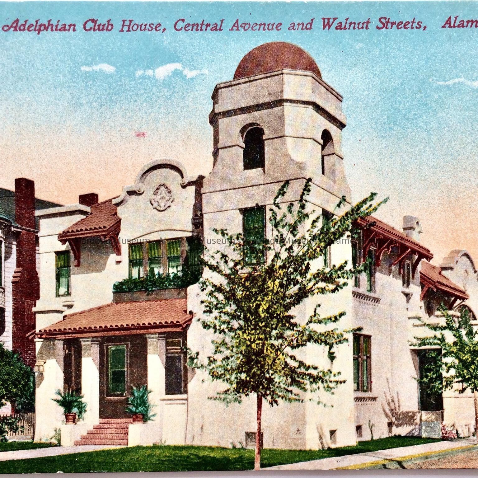 COLORED PHOTOLITHOGRAPHIC POSTCARD, WITH CAPTION, "ADELPHIAN CLUBHOUSE, CENTRAL AVENUE AND WALNUT STREET." EDWARD H MITCHELL, PUBLISHER, SAN FRANCISCO. UNCIRCULATED.