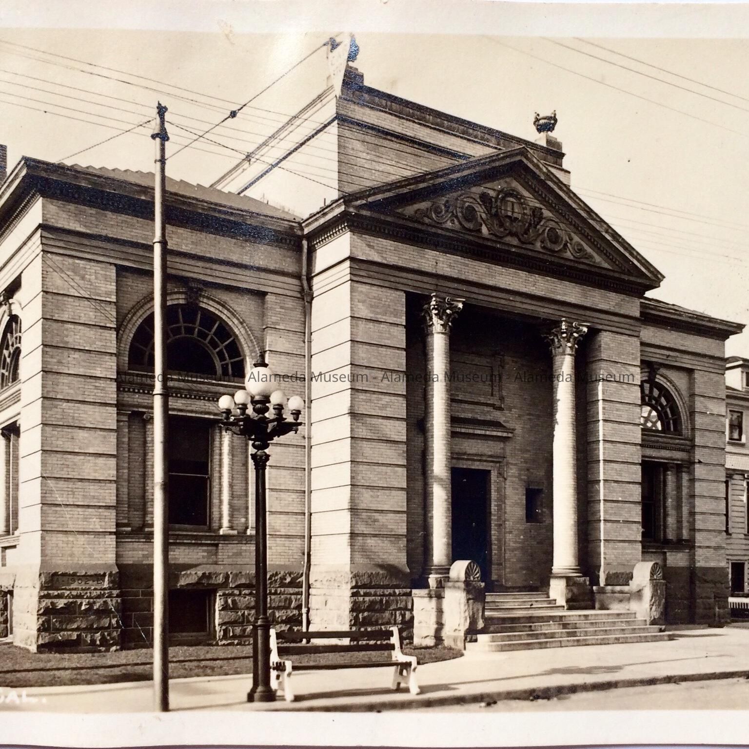 History of Object: Photographic postcard depicting the main facade of the Alameda Free Library, southwest corner of Santa Clara Avenue and Oak Street, erected 1902.