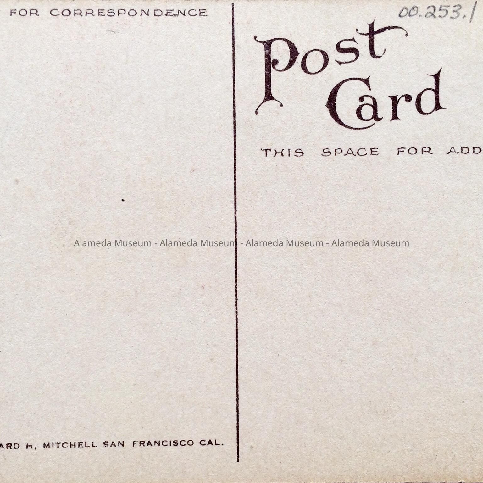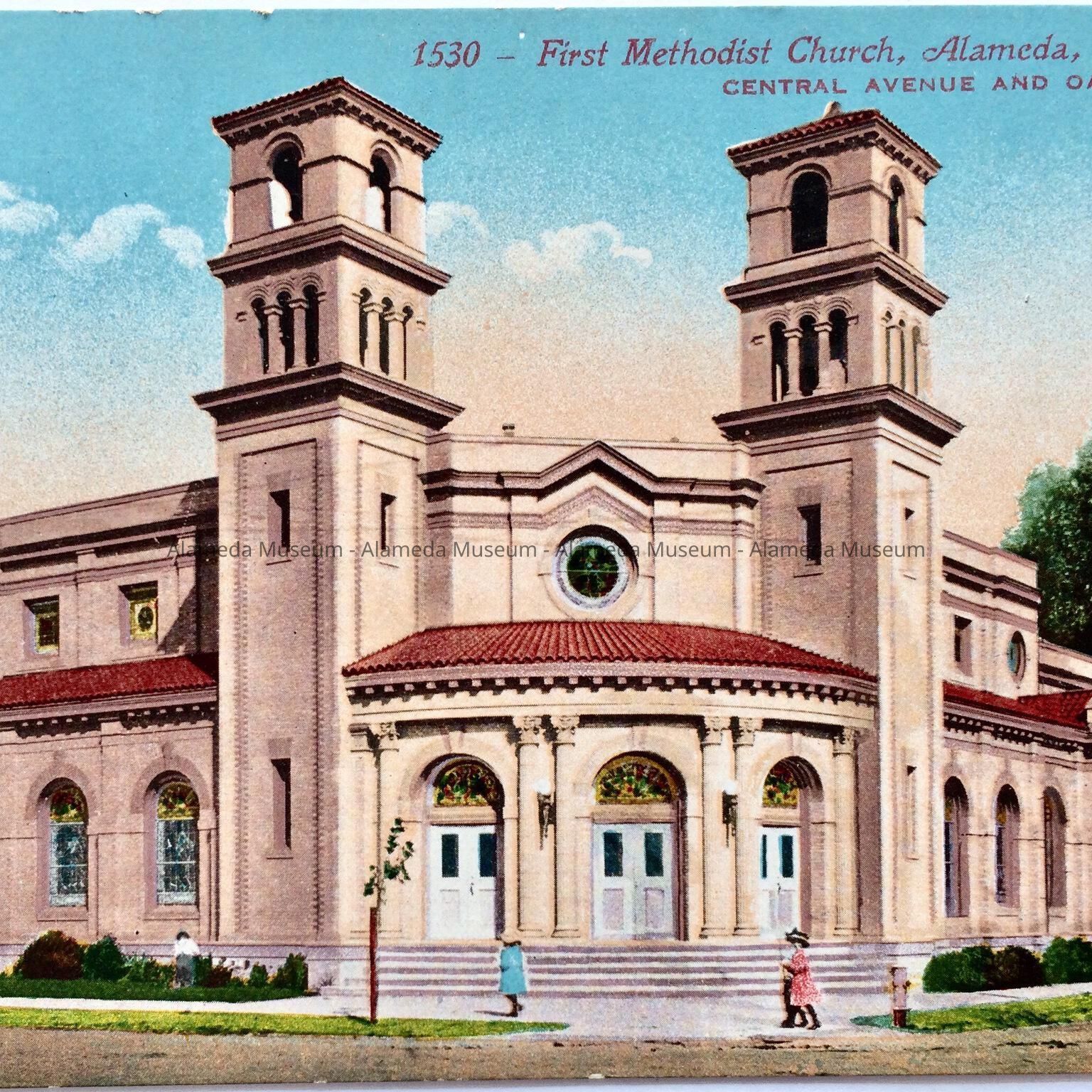 DESCRIPTION: A COLORED LITHOGRAPHIC POSTCARD, WITH CAPTION, "FIRST METHODIST CHURCH, ALAMEDA, CAL." EDWARD H MITCHELL, PUBLISHER, SAN FRANCISCO. UNCIRCULATED.