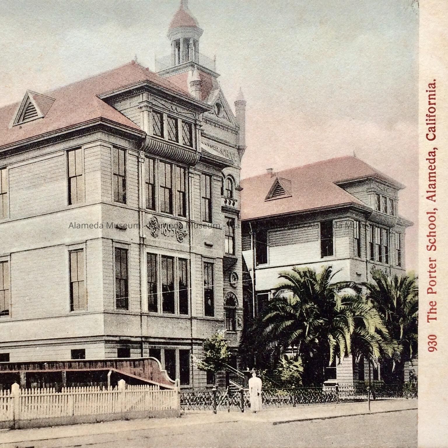 Postcard depicting the main façade of the original Porter School on Alameda Avenue, near Oak Street.