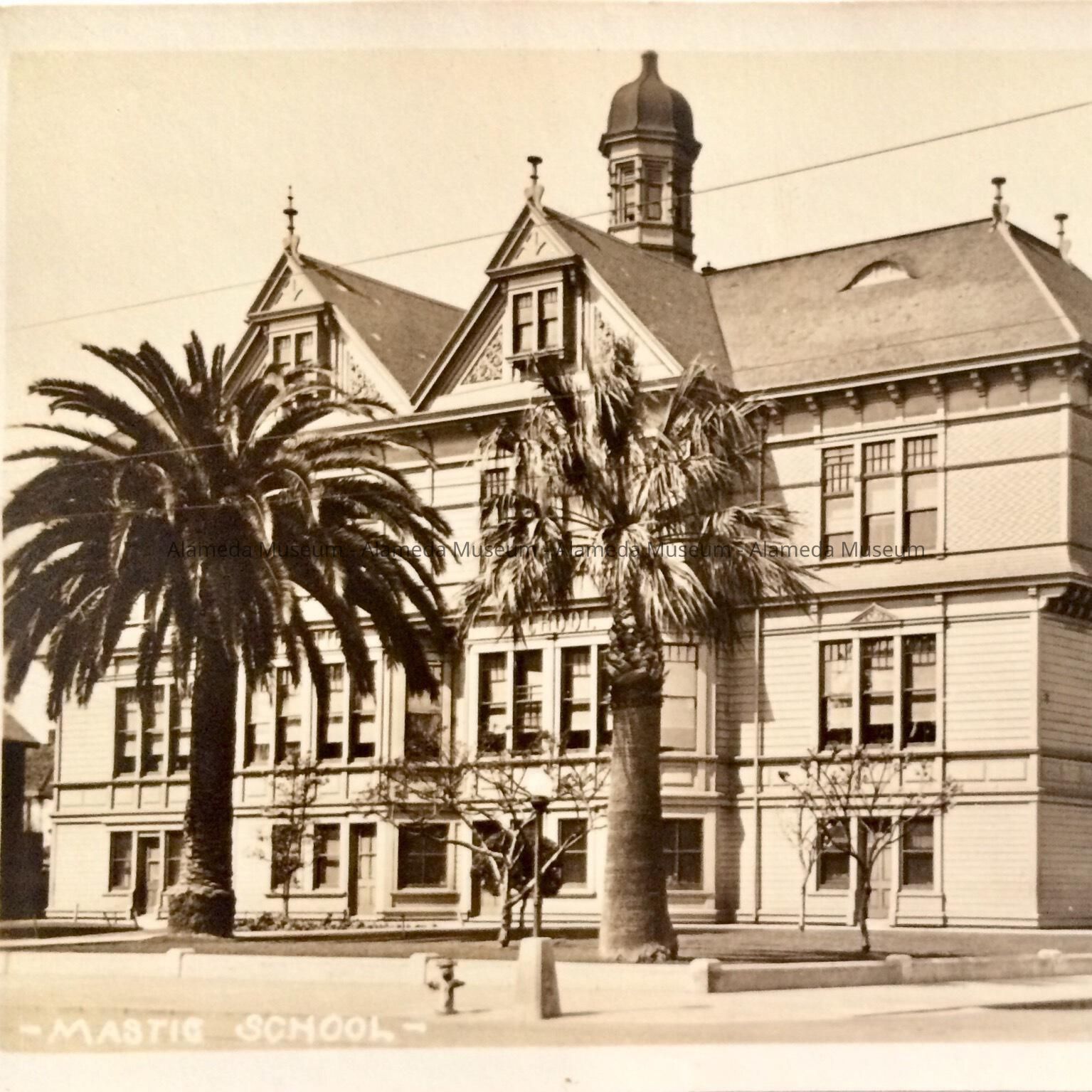 Description: Uncirculated postcard, of a black-and-white photo with white edging of a 4-story building, with palm trees reaching to the top of the third floor, and a lamppost and fire hydrant. No publisher information. In white on negative: Mastic School (note misspelling), Alameda, CAl.