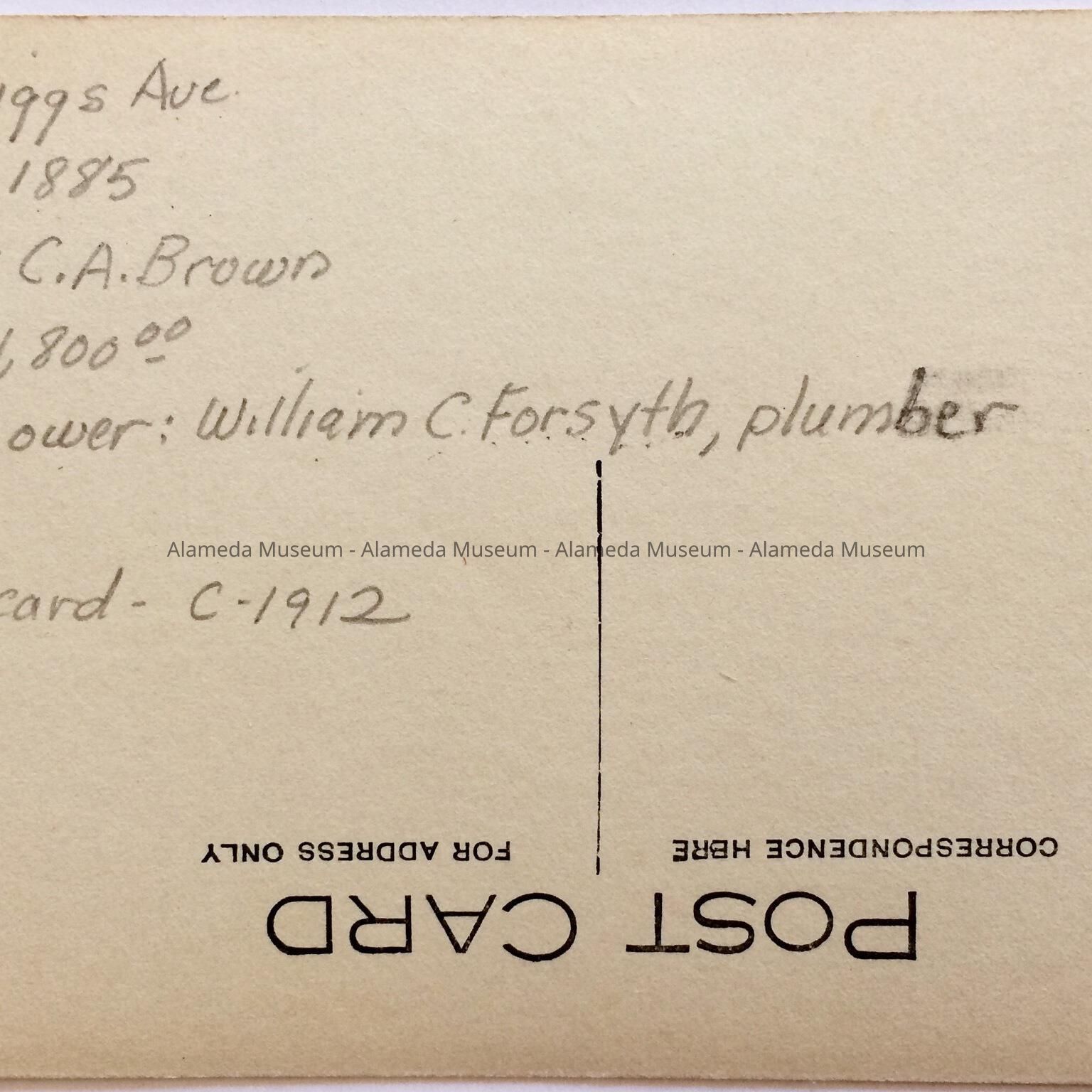 HISTORY OF OBJECT: A POSTCARD DEPICTING THE MAIN FACADE OF 3219 BRIGGS AVENUE, ALAMEDA; ERECTED IN 1885. ORIGINAL OWNER WAS WILLIAM C. FORSYTH. THE HOME IS STILL STANDING.