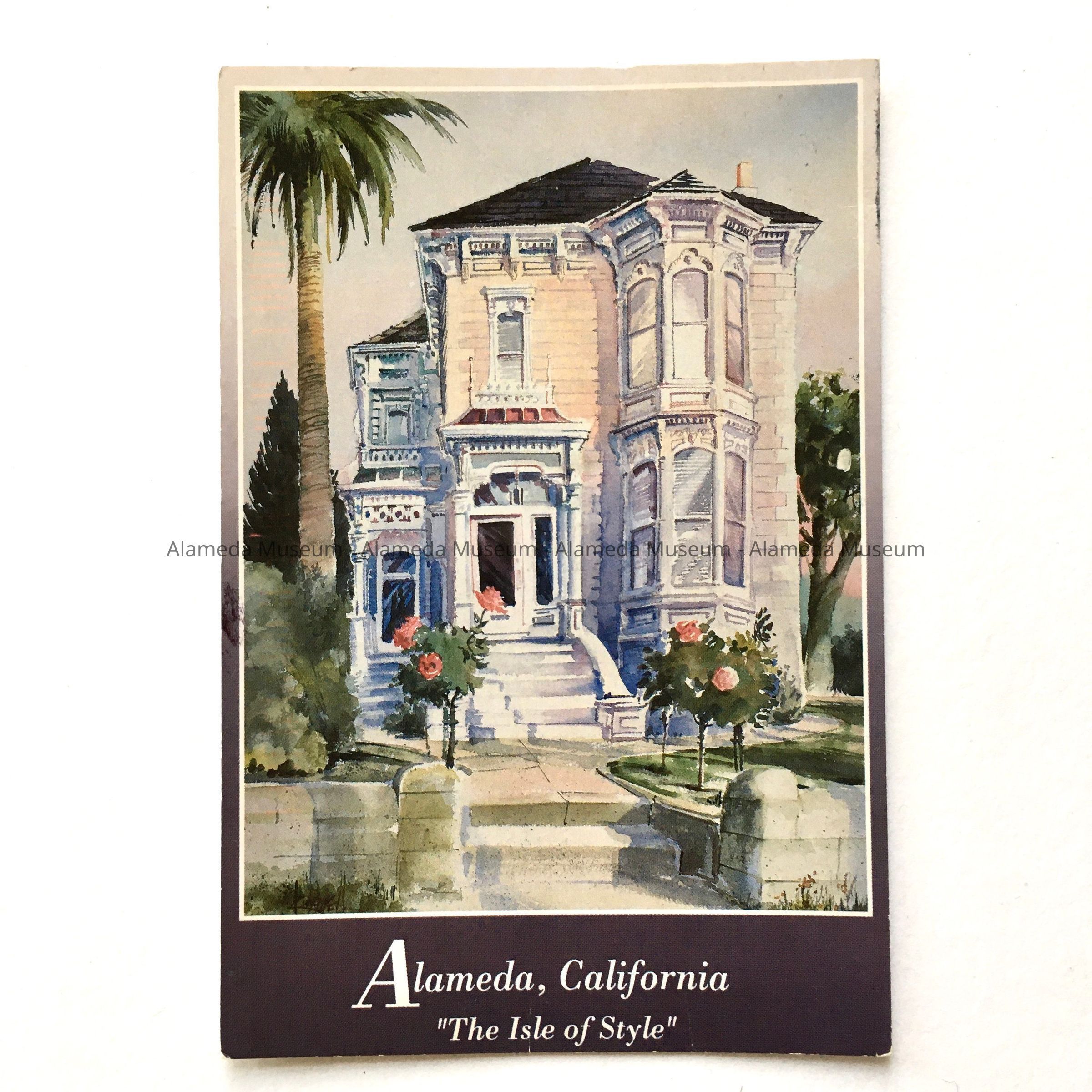 History of Object: postcard sent to the donor. The subject of the watercolor painting is the Italianate residence at 900 Grand Ave, built 1879. Possibly published by the artist, Jim Kingwell (1950-), who attended Alameda High School, class of 1968, and contributed cartoons to the Alameda Journal in the 1980s, before moving to Maui. It is unknown at this time who or which organization coined the term 'Isle of Style'.