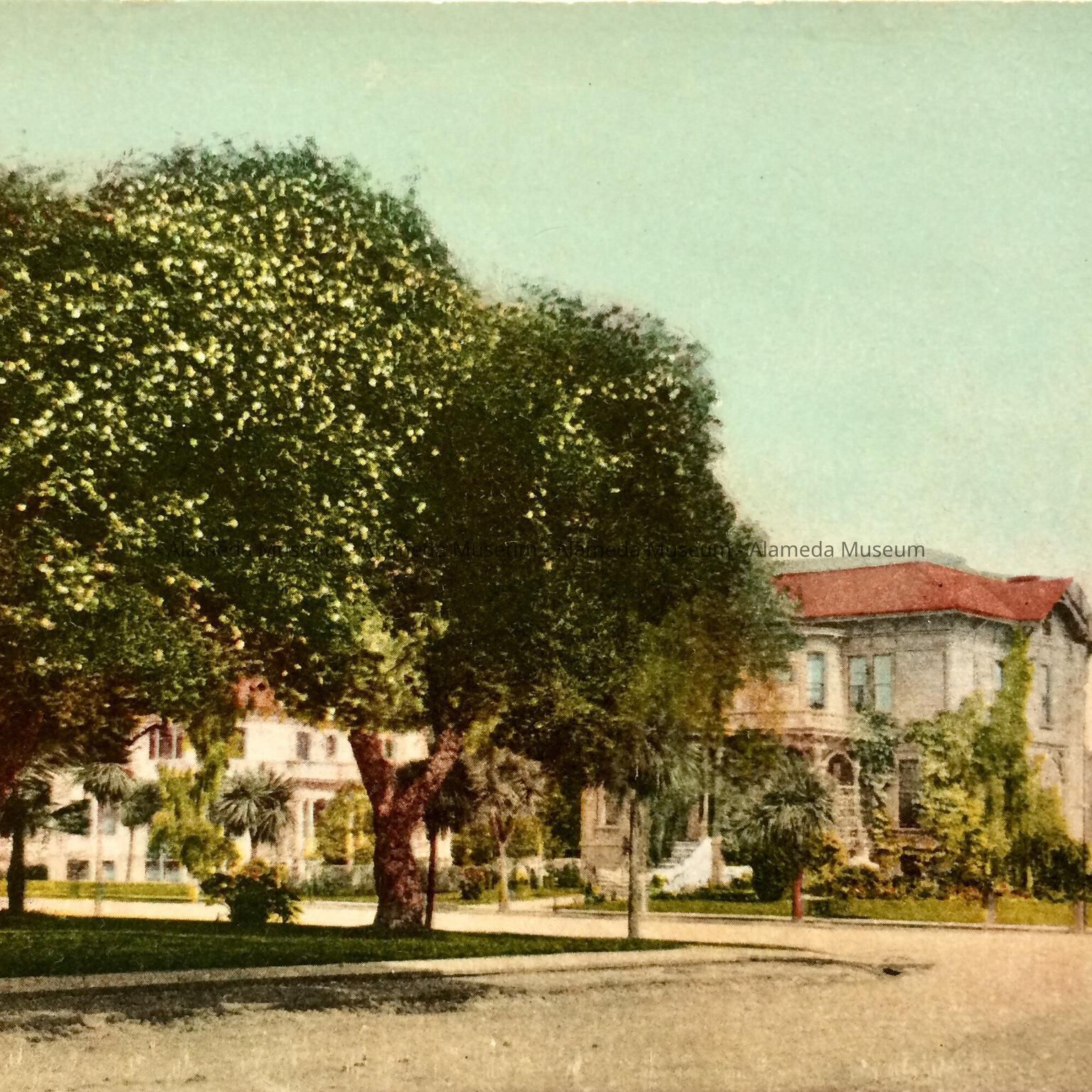 History of Object: Postcard depicting a rose covered oak at the southwest corner of Grand Street and Central Avenue.