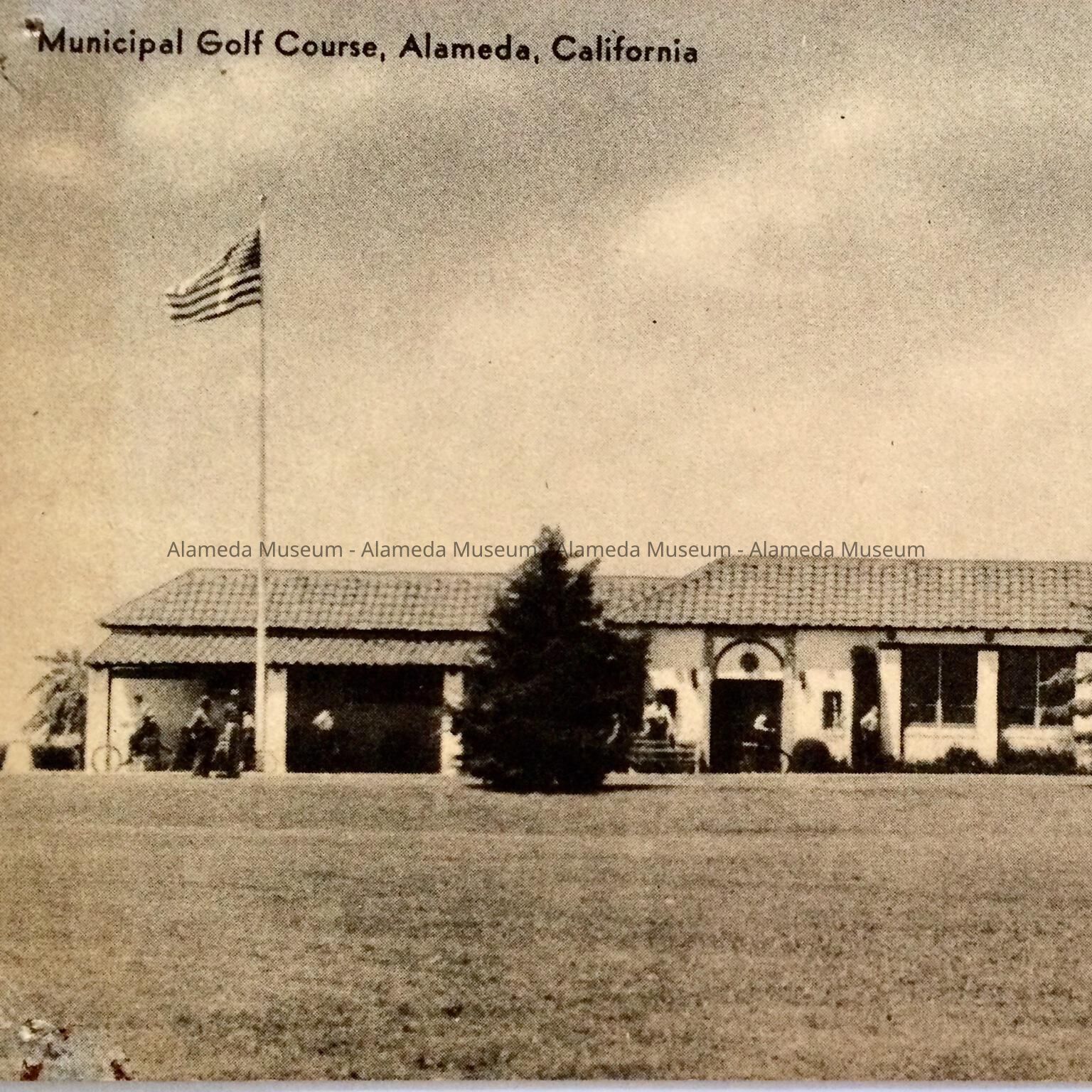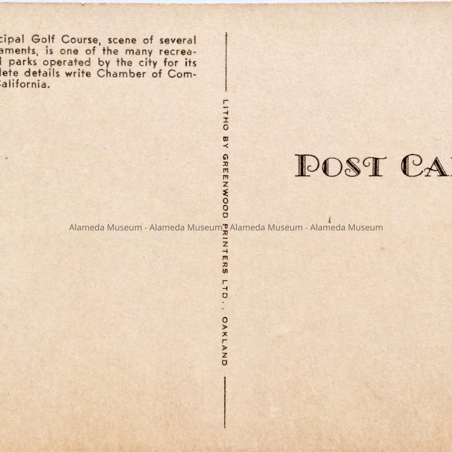 BLACK-AND-WHITE PHOTOLITHOGRAPHIC POSTCARD, WITH CAPTION, "MUNICIPAL GOLF COURSE, ALAMEDA, CALIF." PRINTED BY GREENWOOD PRINTERS, LTD, OAKLAND, CALIFORNIA. UNCIRCULATED.